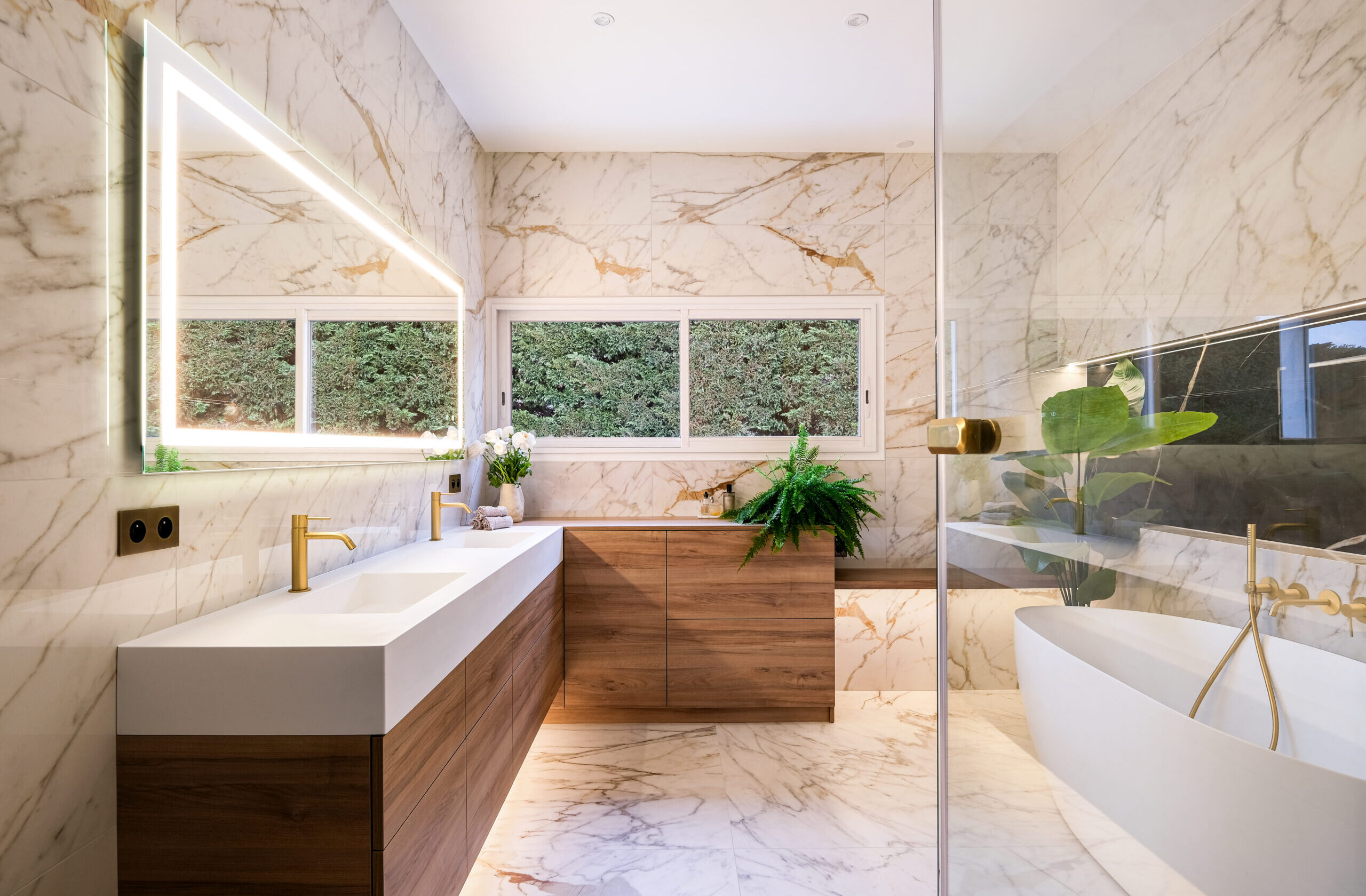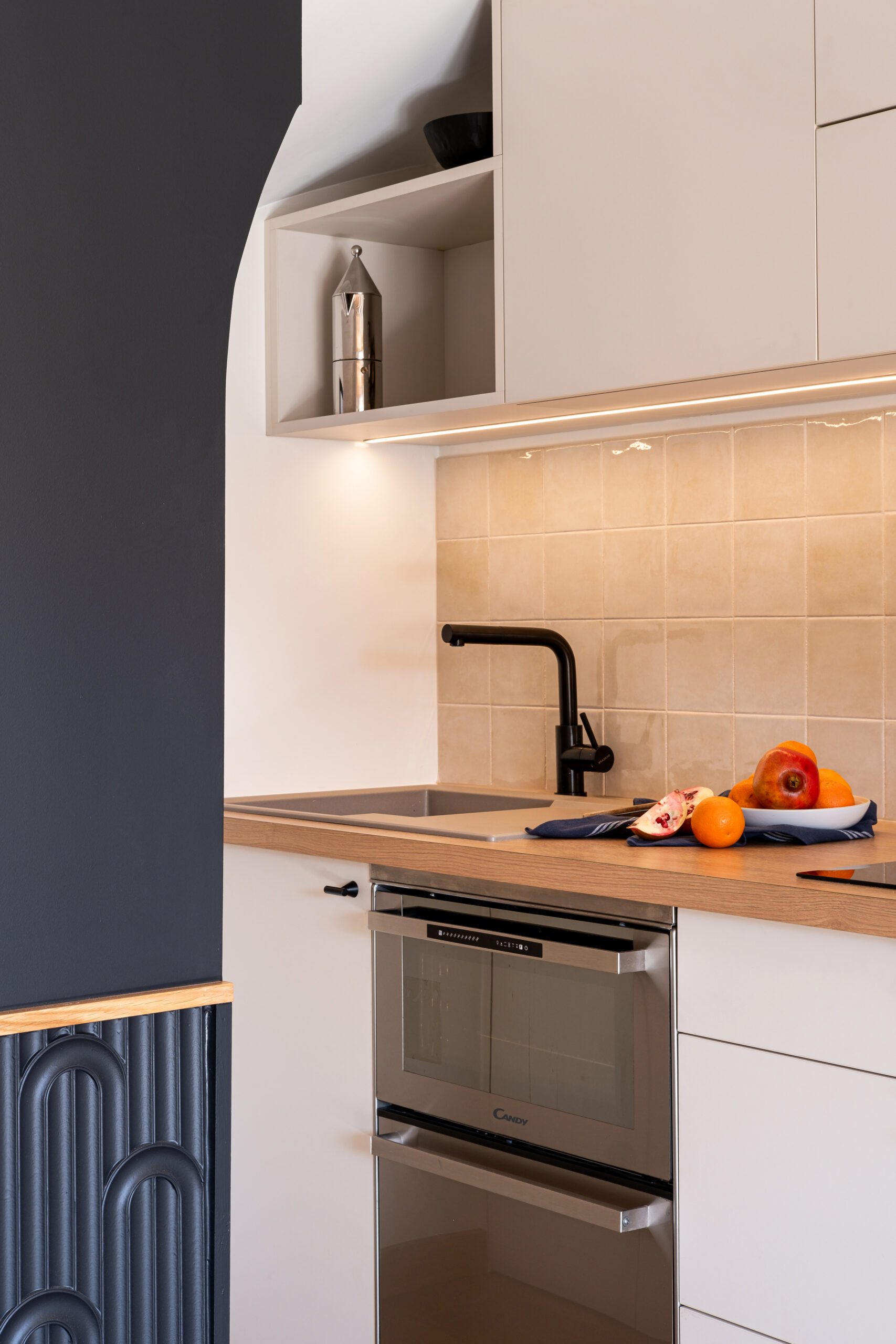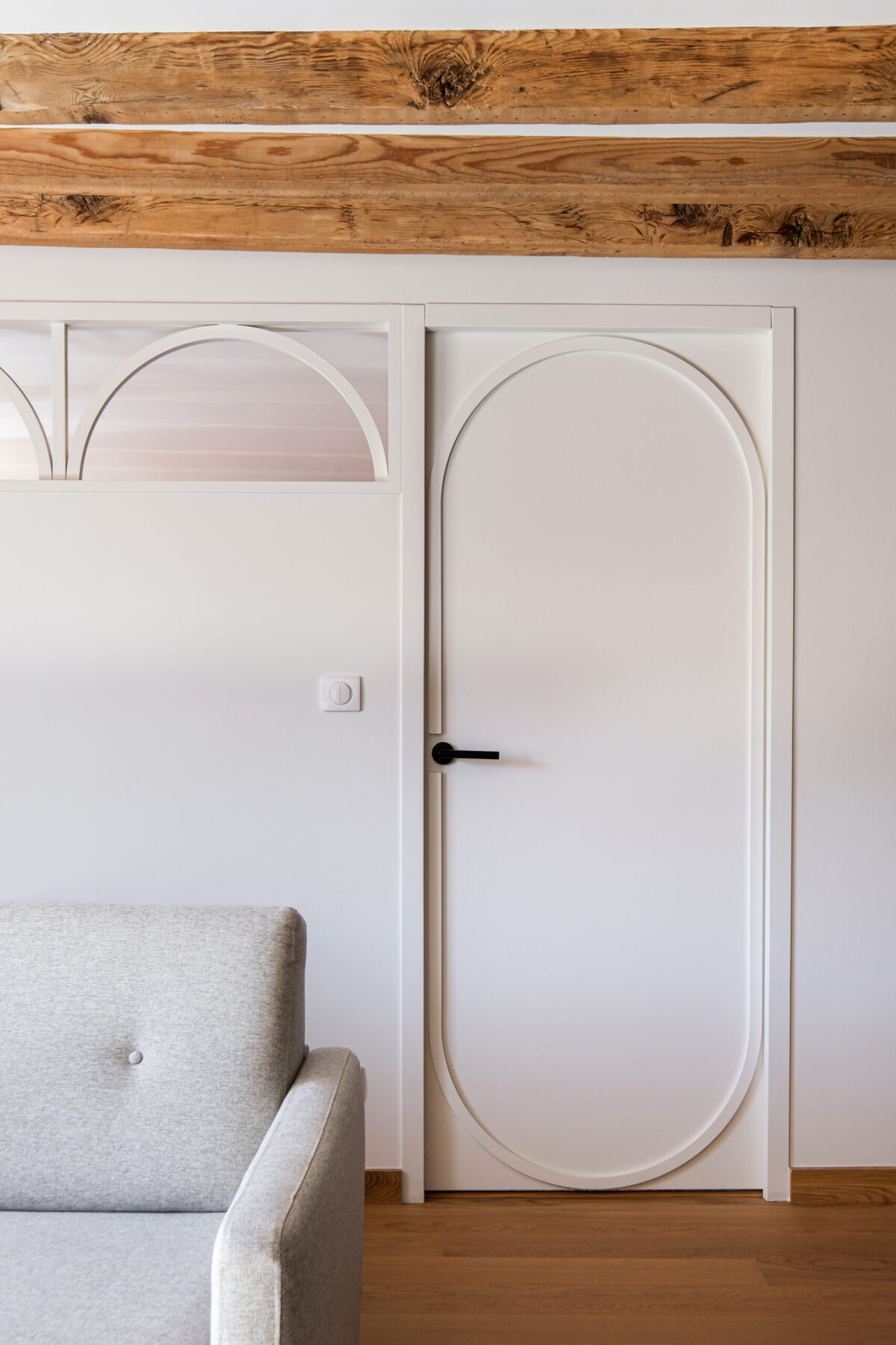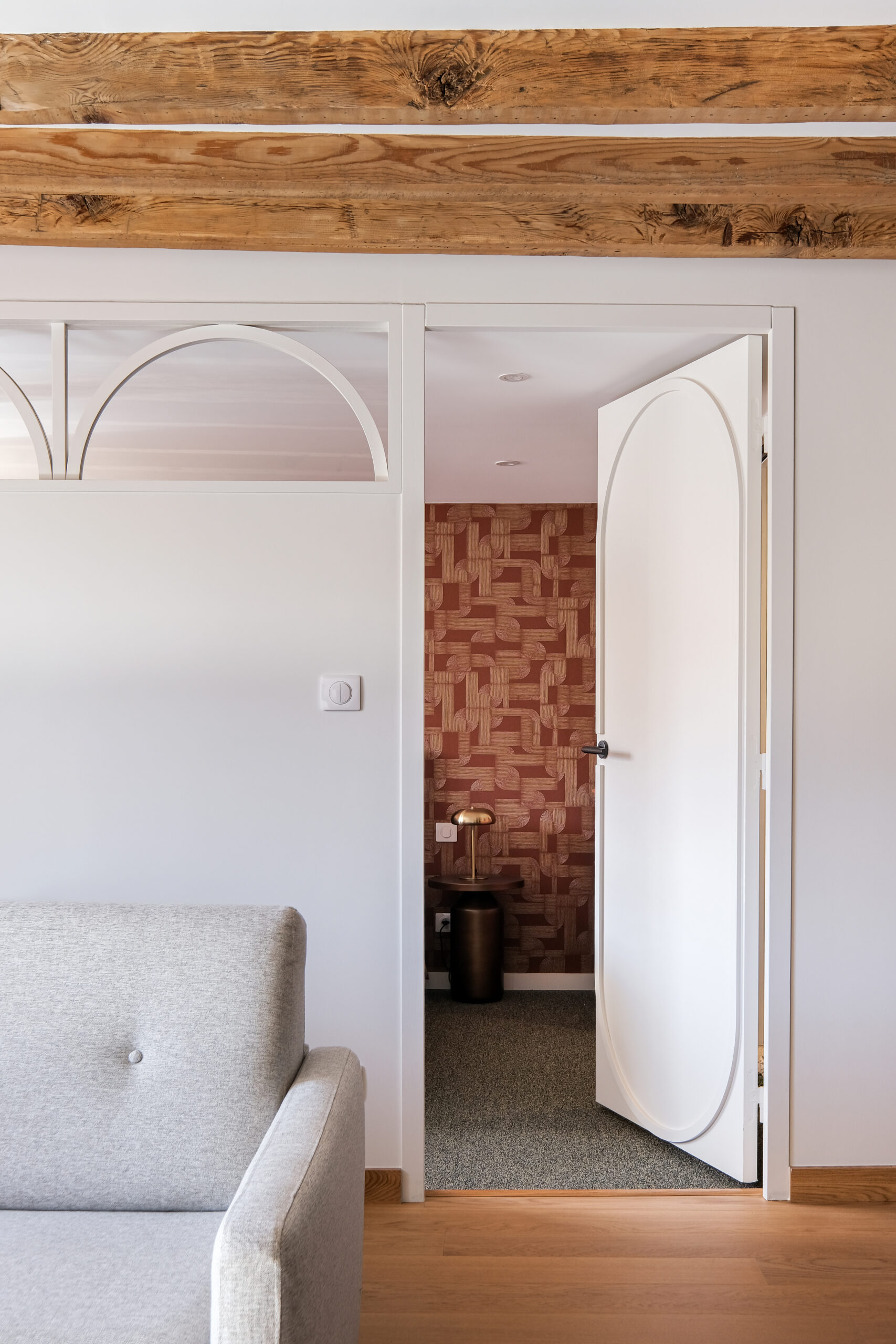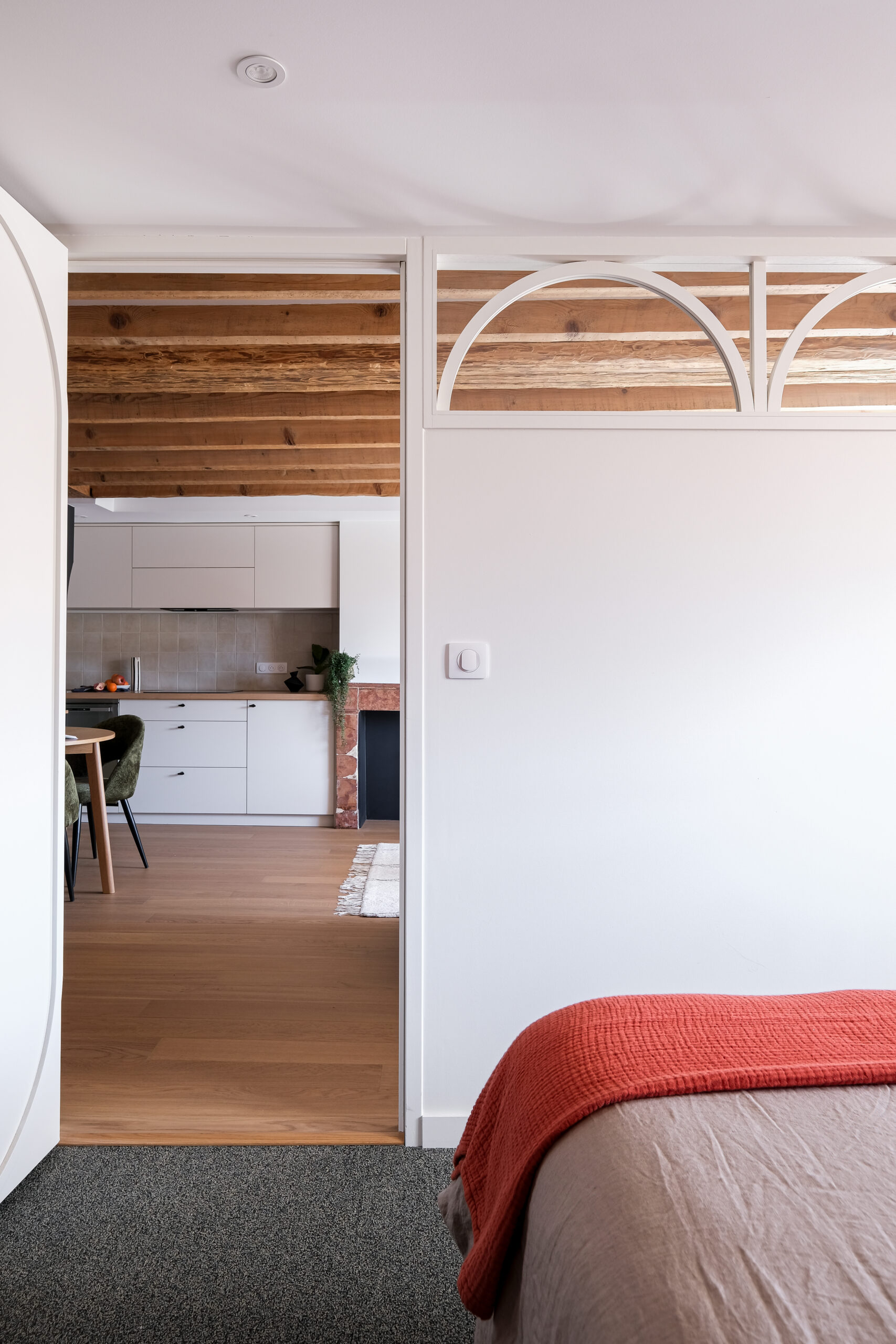 Chaque détail a été pensé pour allier esthétique et praticité : niches rétroéclairées, rangements intégrés, verrières cintrées pour filtrer la lumière sans cloisonner.