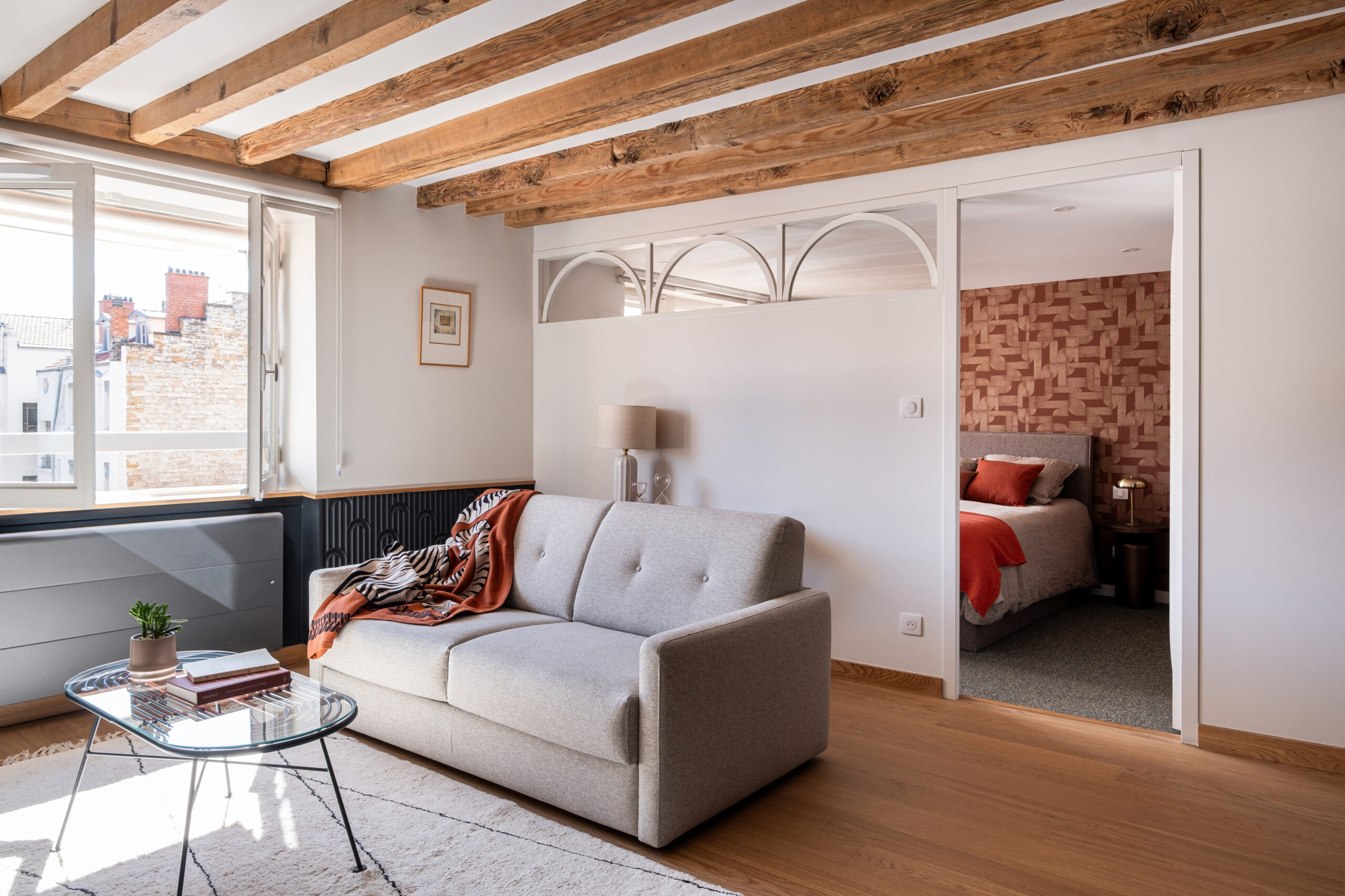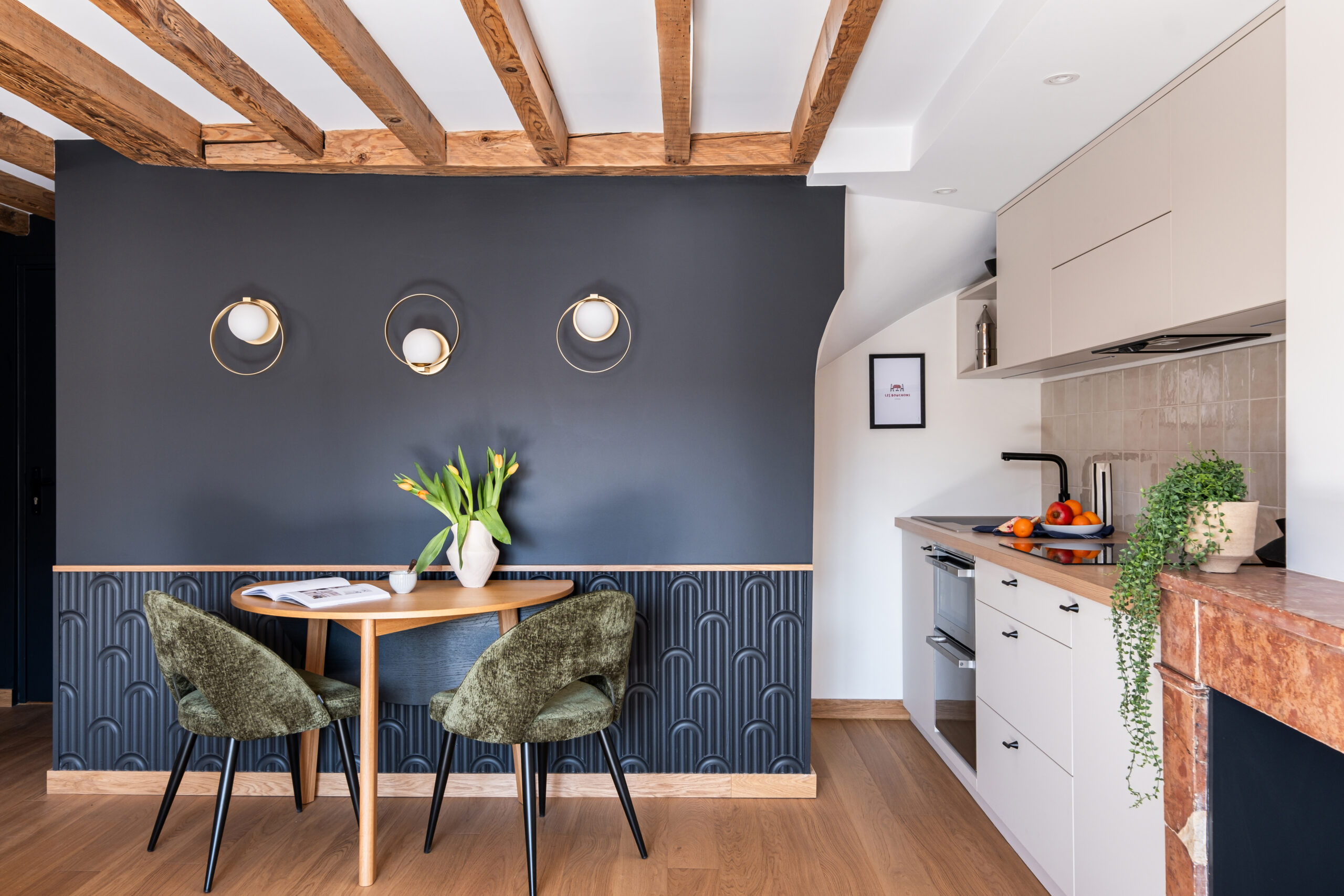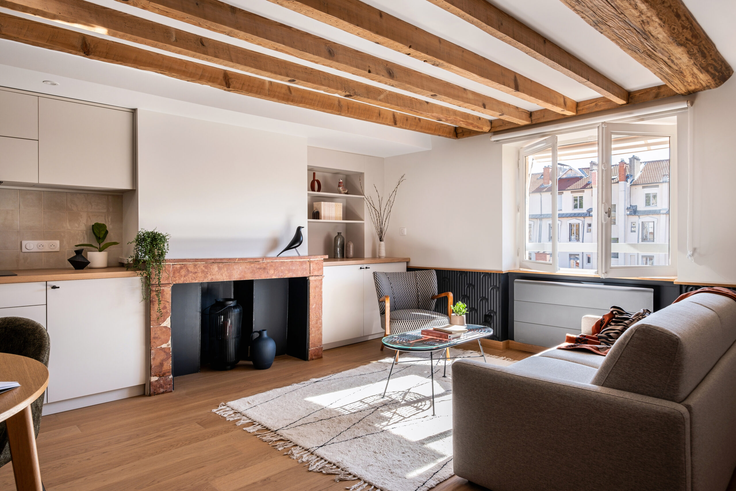 • Les poutres apparentes et le parquet en chêne réchauffent l’atmosphère et ancrent le projet dans son histoire.