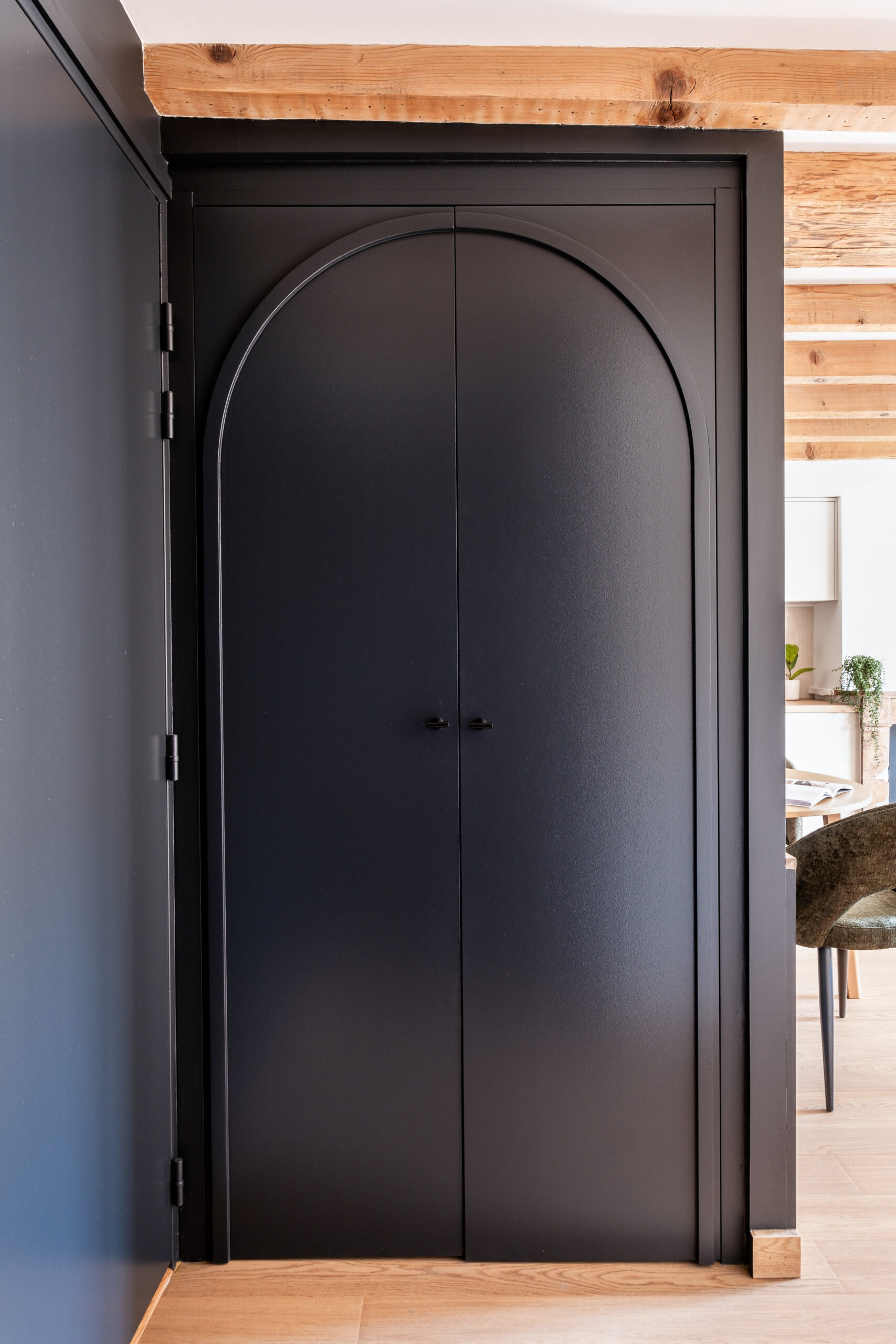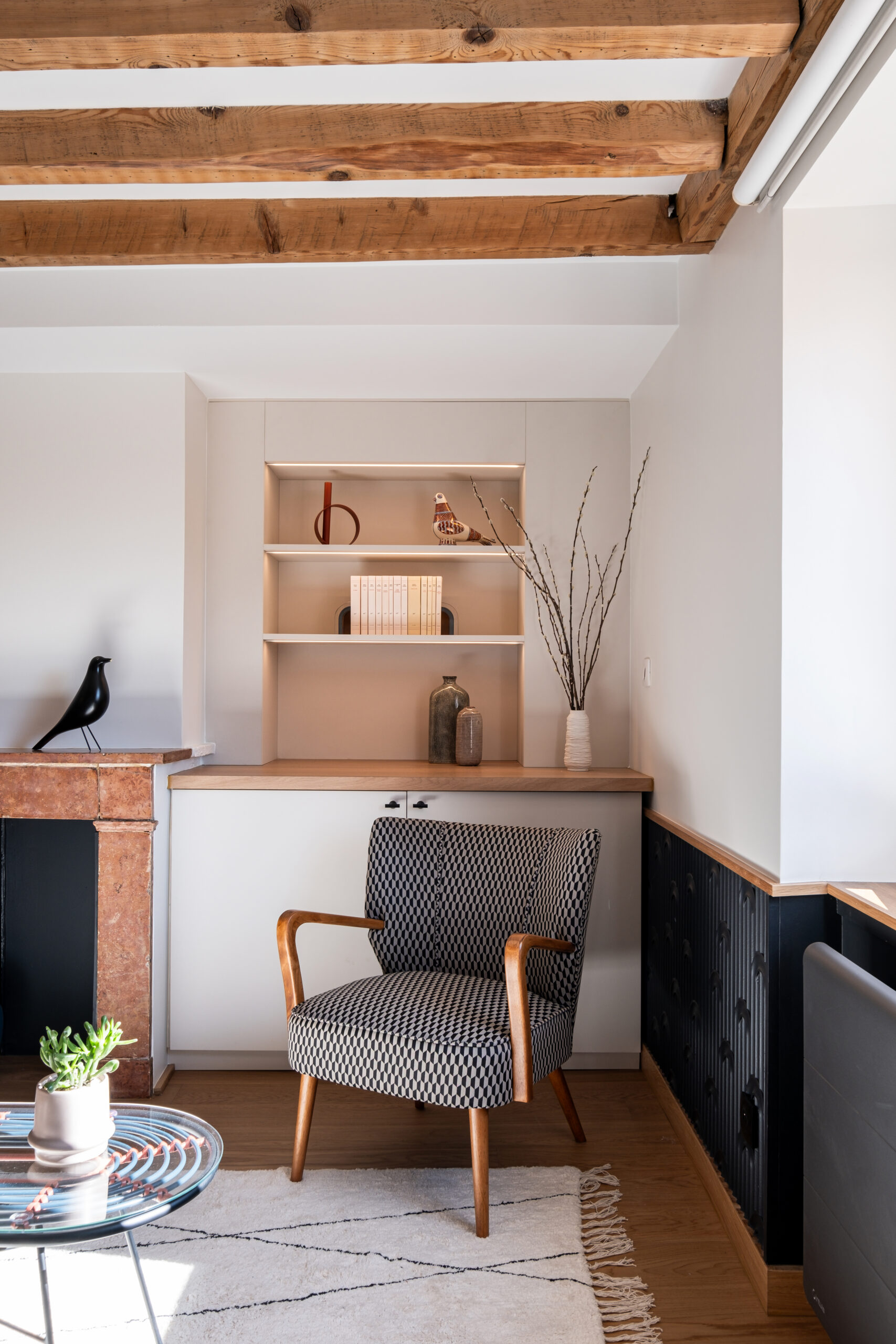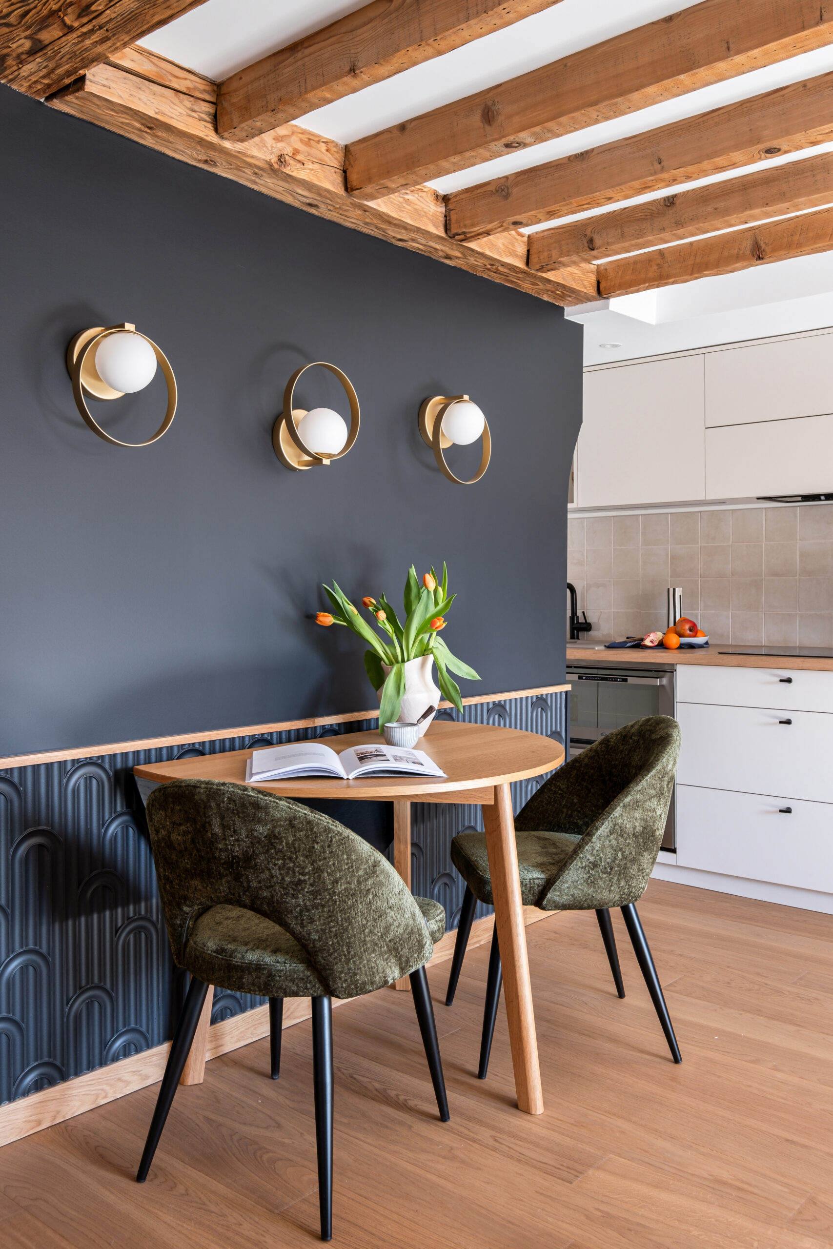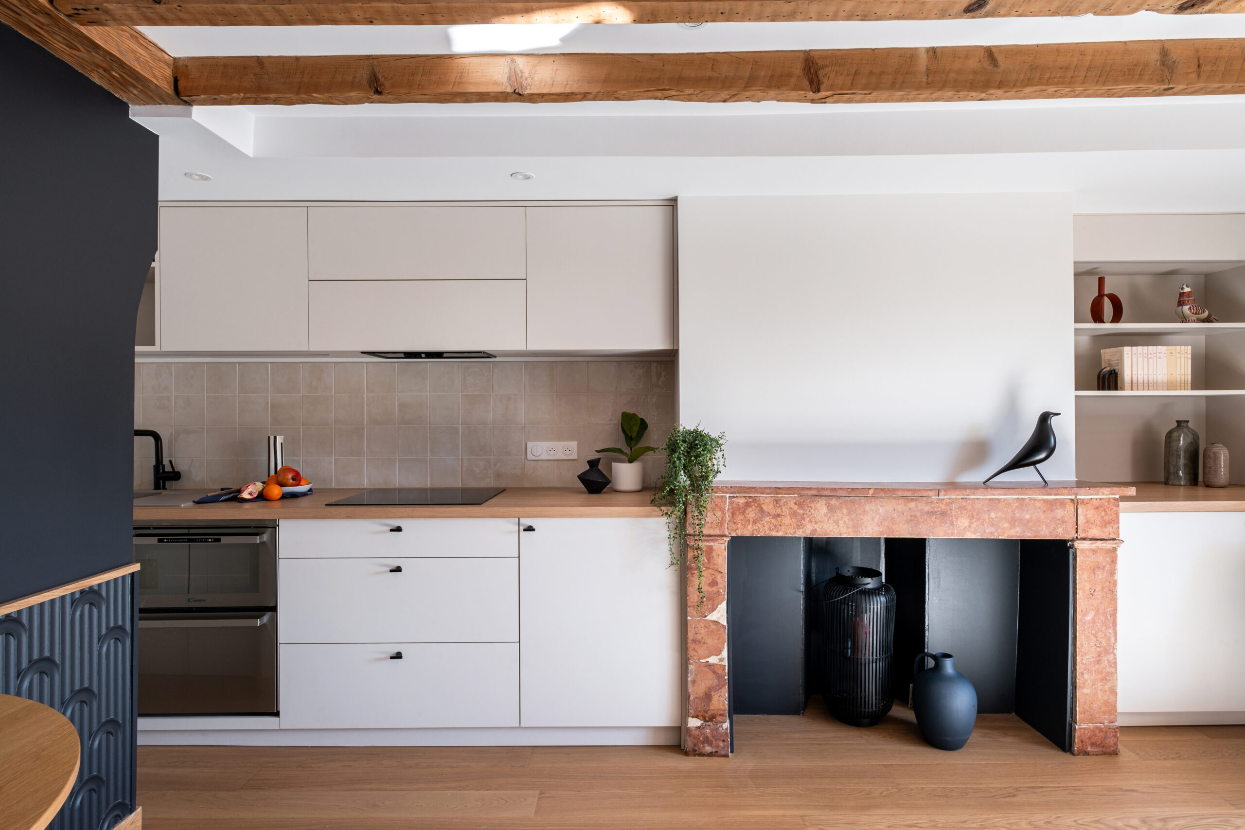 • Les poutres apparentes et le parquet en chêne réchauffent l’atmosphère et ancrent le projet dans son histoire.