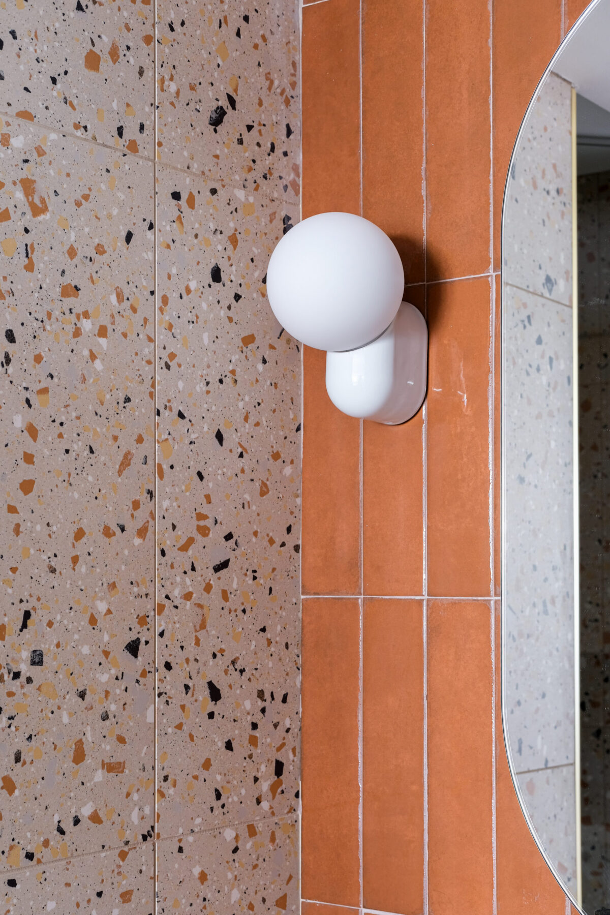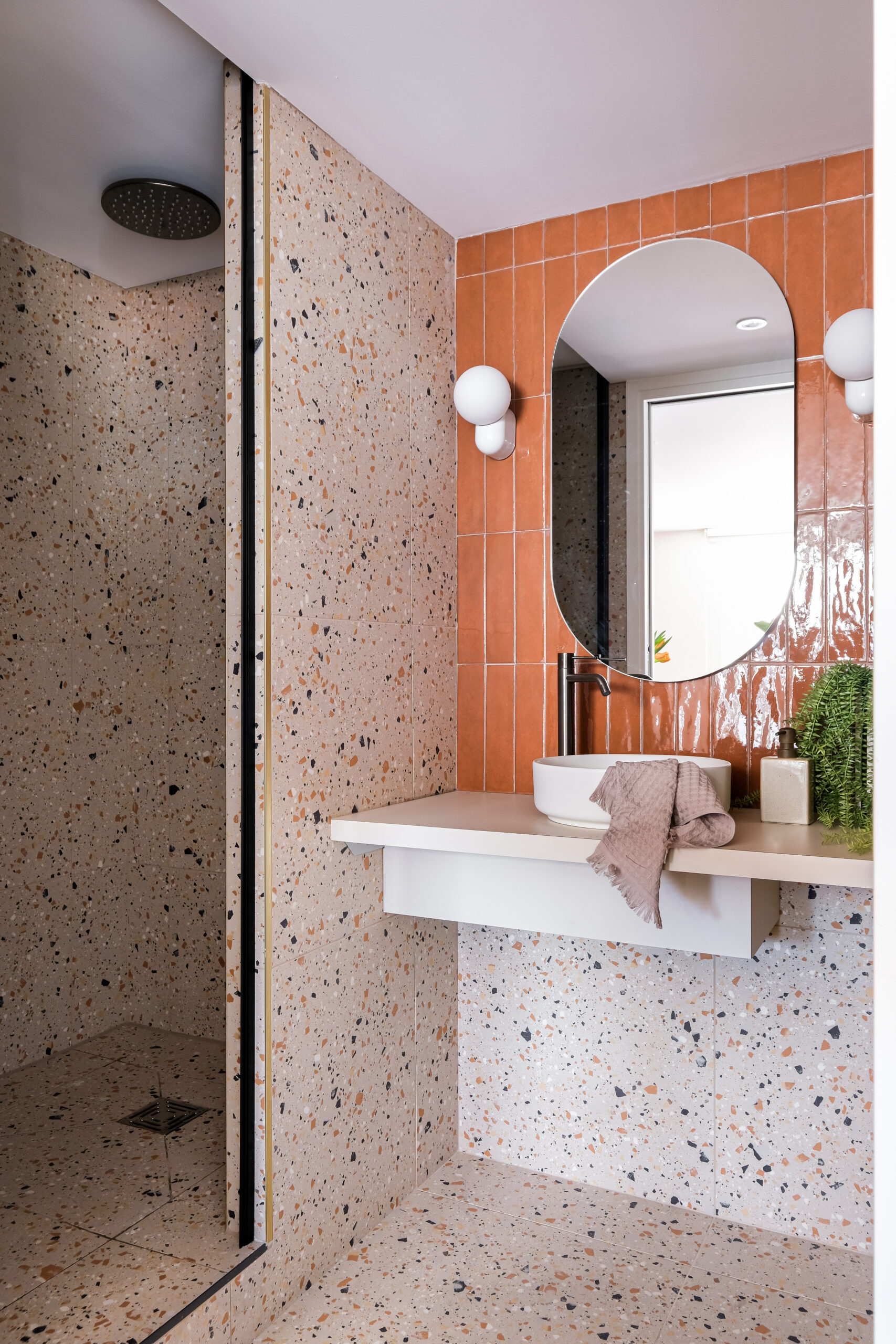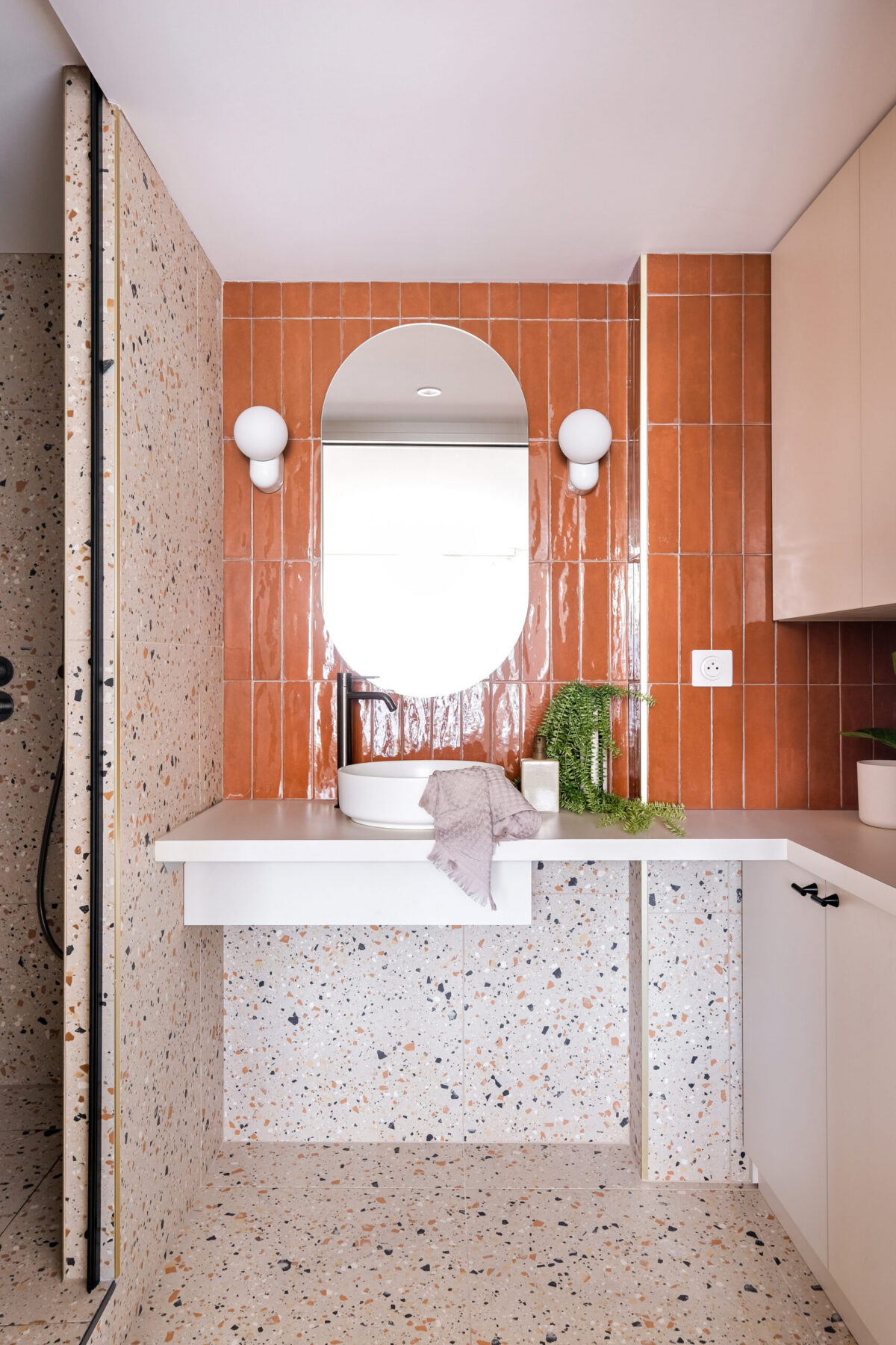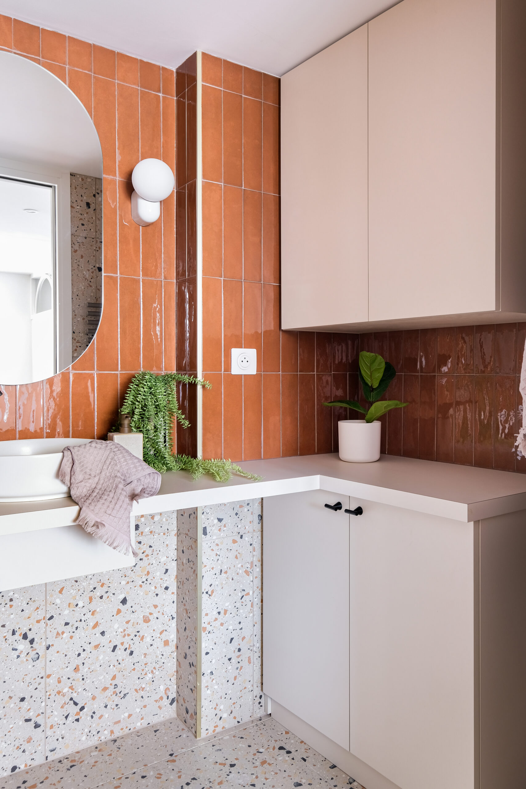 La salle de bain, habillée de carreaux émaillés terracotta et de terrazzo, assume un style graphique et solaire, évoquant la douceur méditerranéenne au cœur de Lyon.