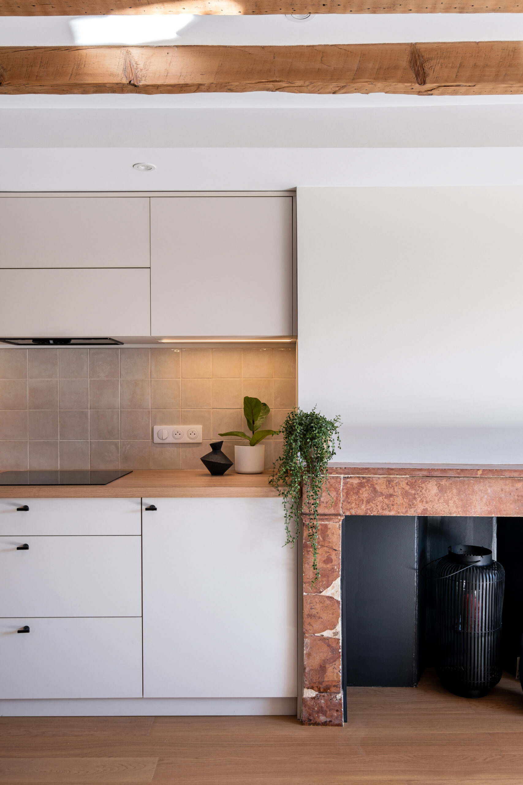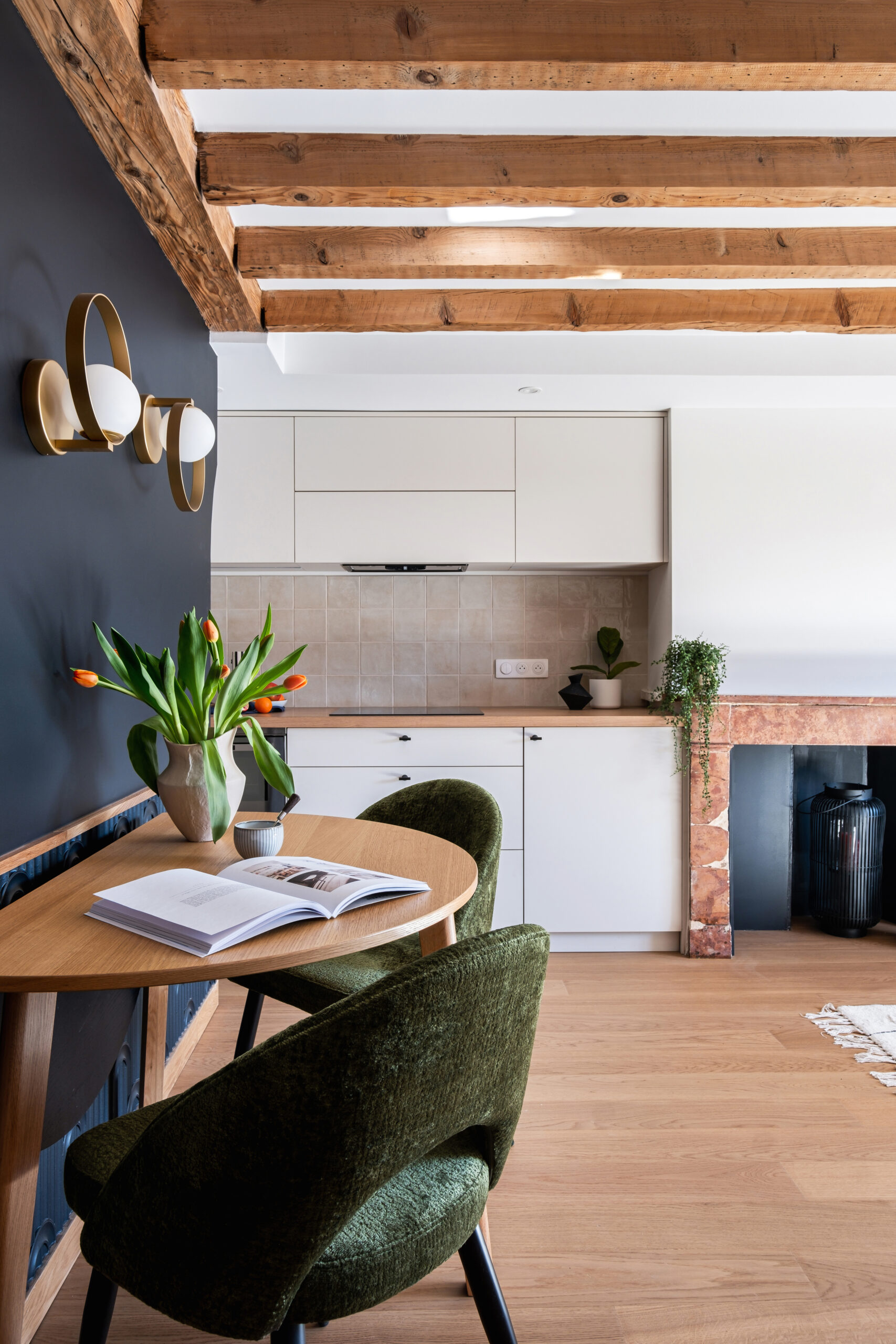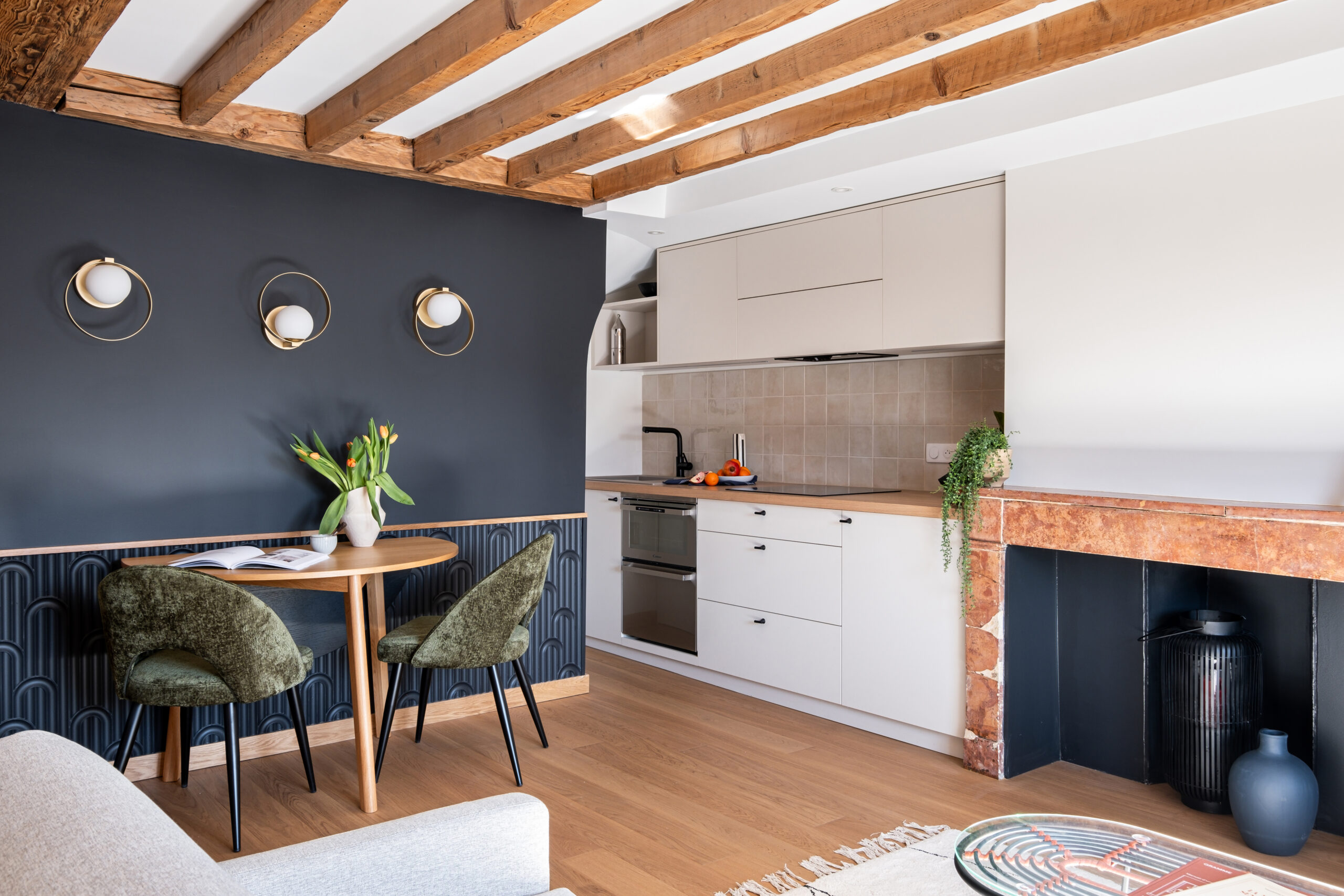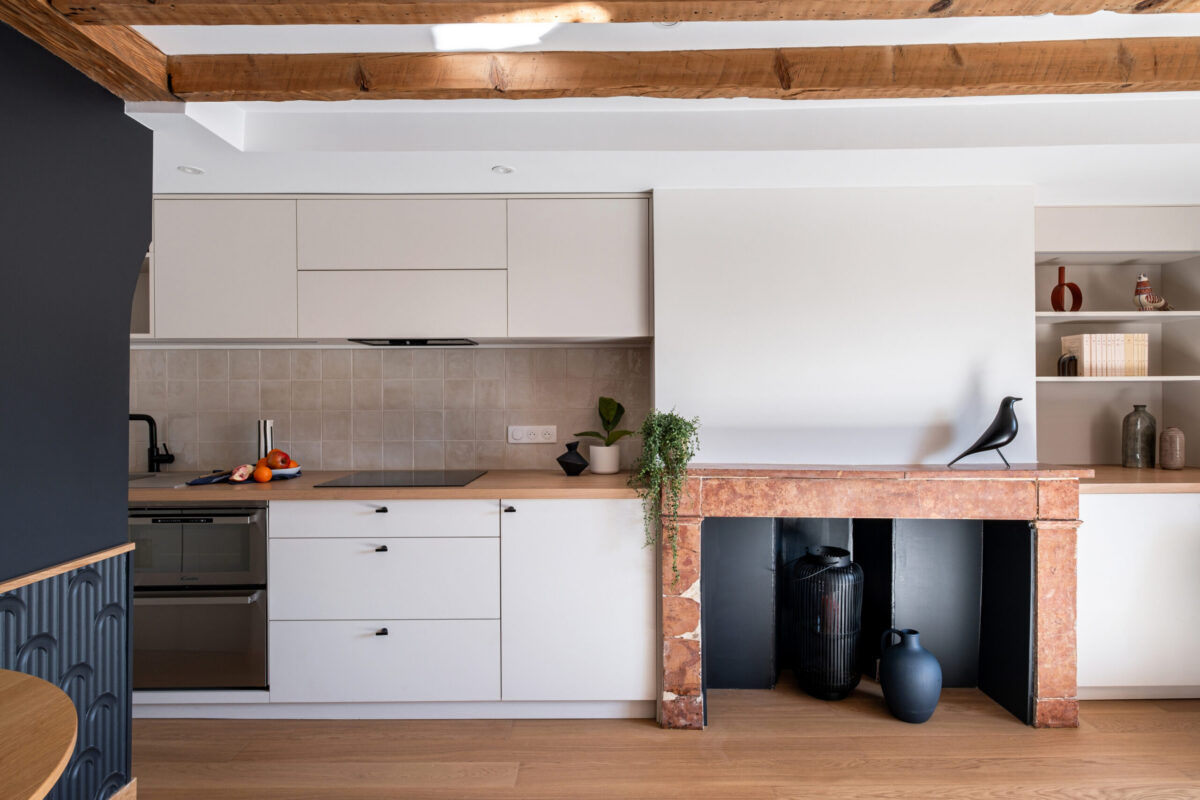 L’espace cuisine, compact mais soigné, s’ouvre sur la pièce de vie. Les tons neutres du mobilier sur mesure dialoguent avec la cheminée en pierre rosée et les fauteuils en velours vert, pour une palette automnale feutrée.