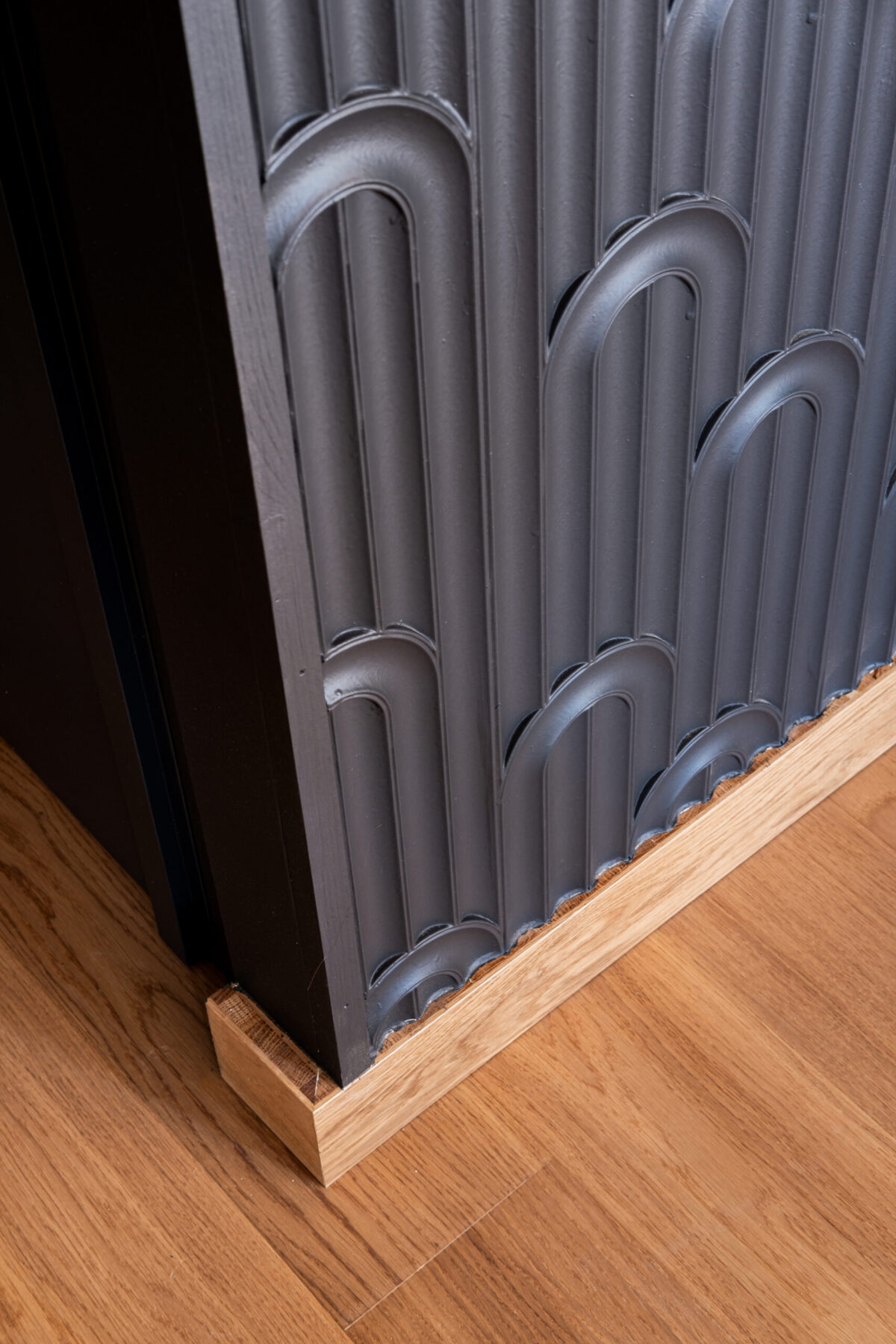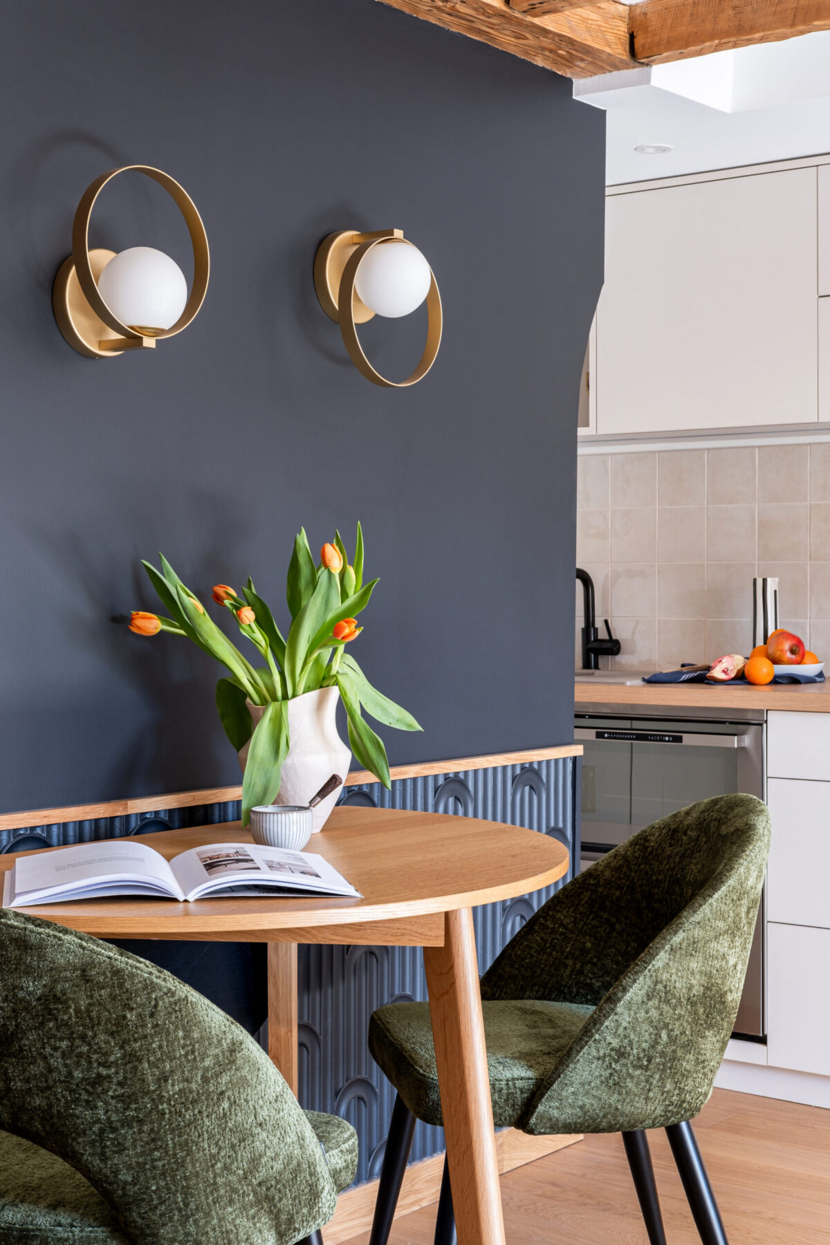 • Le bleu-gris profond des murs structure les volumes, mis en valeur par une frise en demi-arcs moulurés d’esprit Art déco.