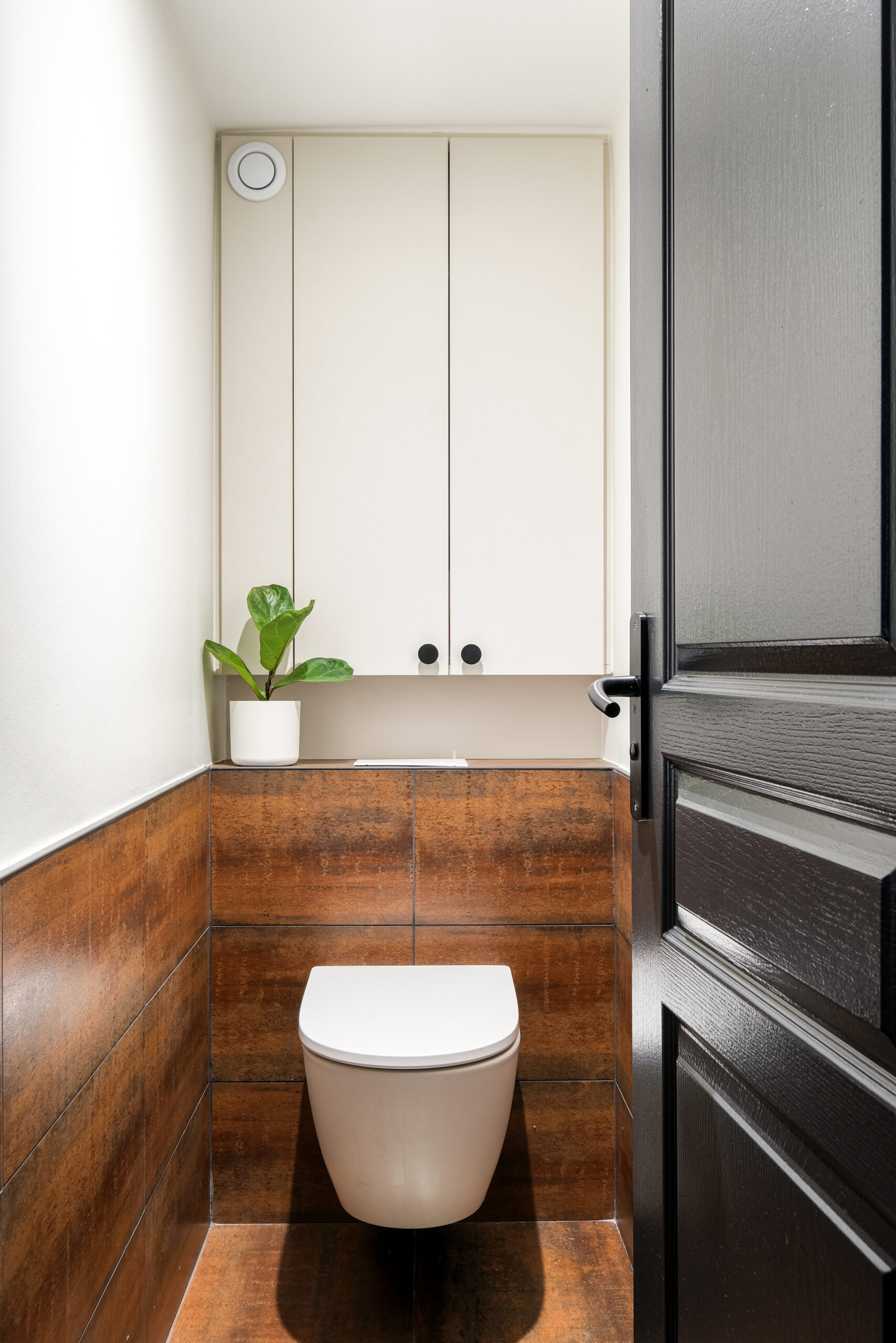 • Les touches dorées des luminaires et les accents terracotta de la salle de bain créent une continuité élégante entre les pièces.