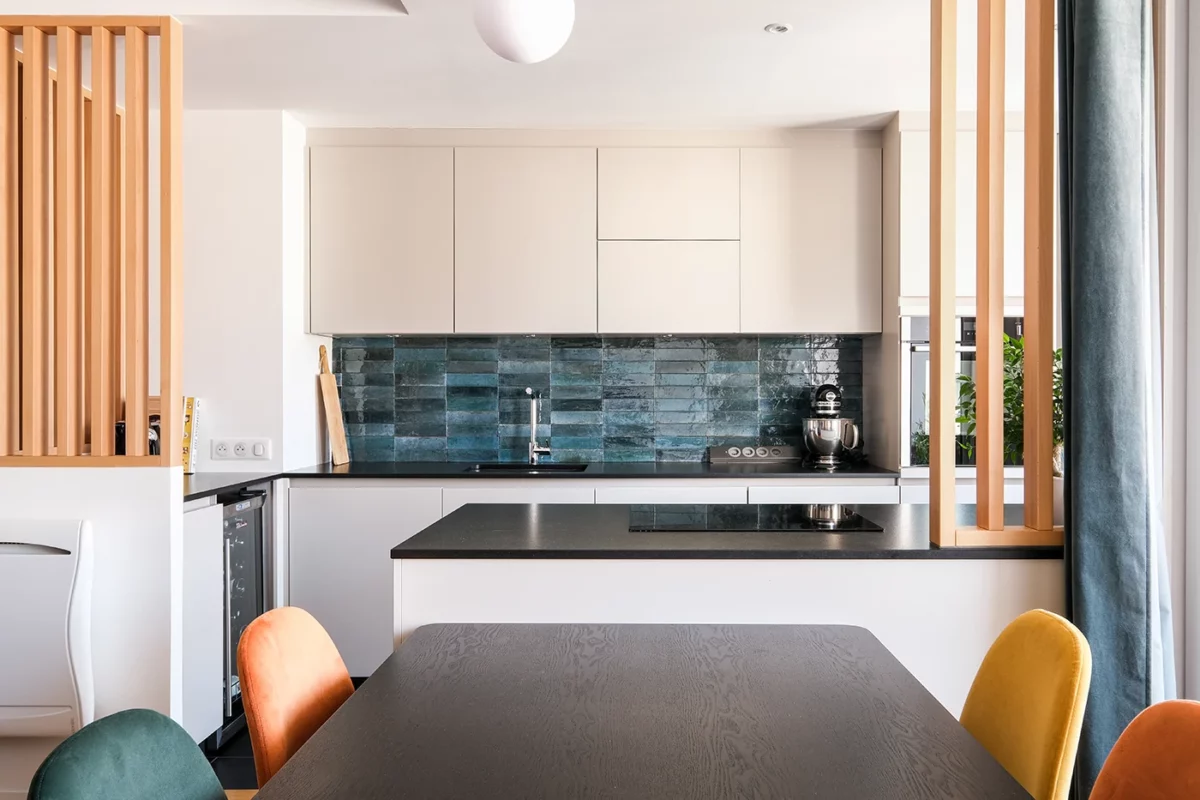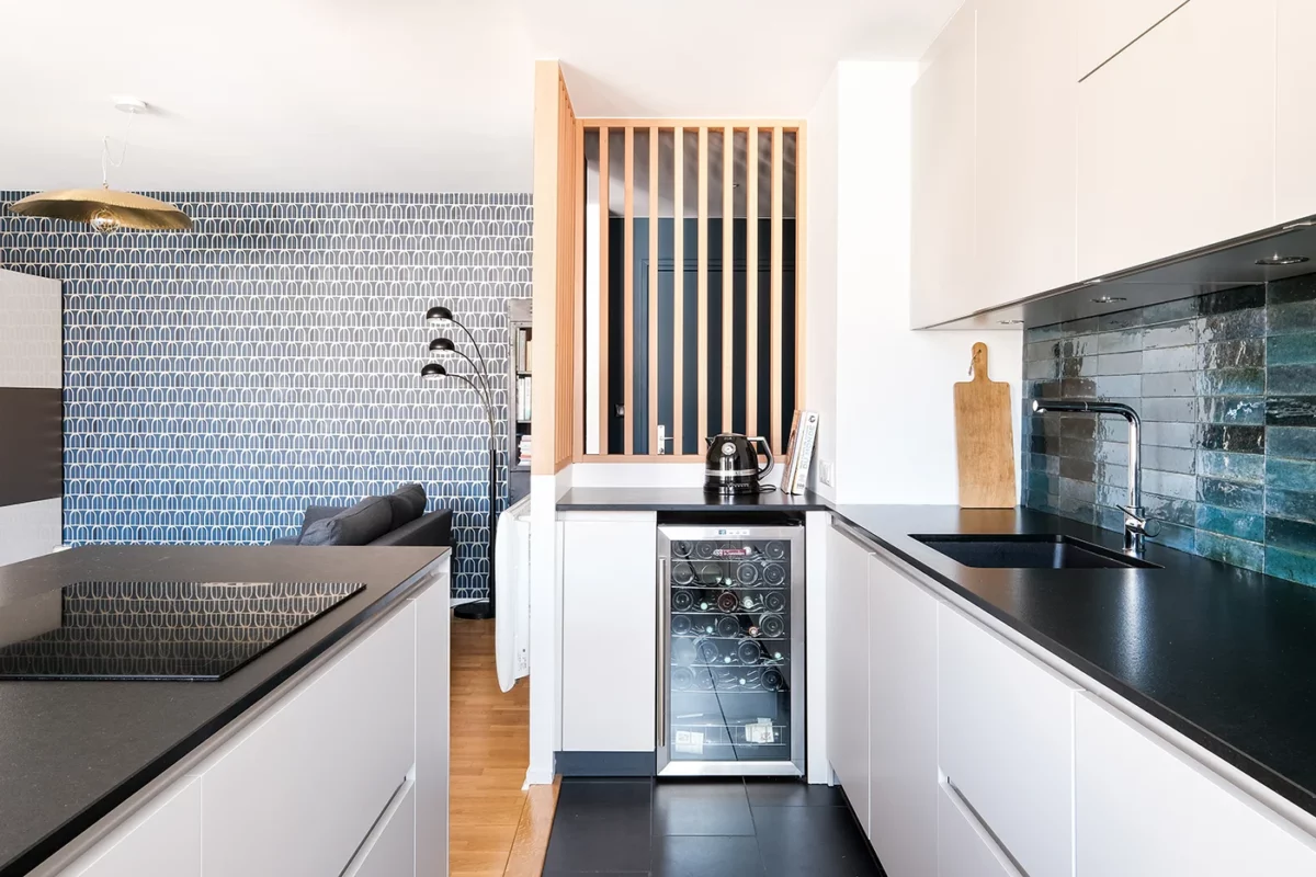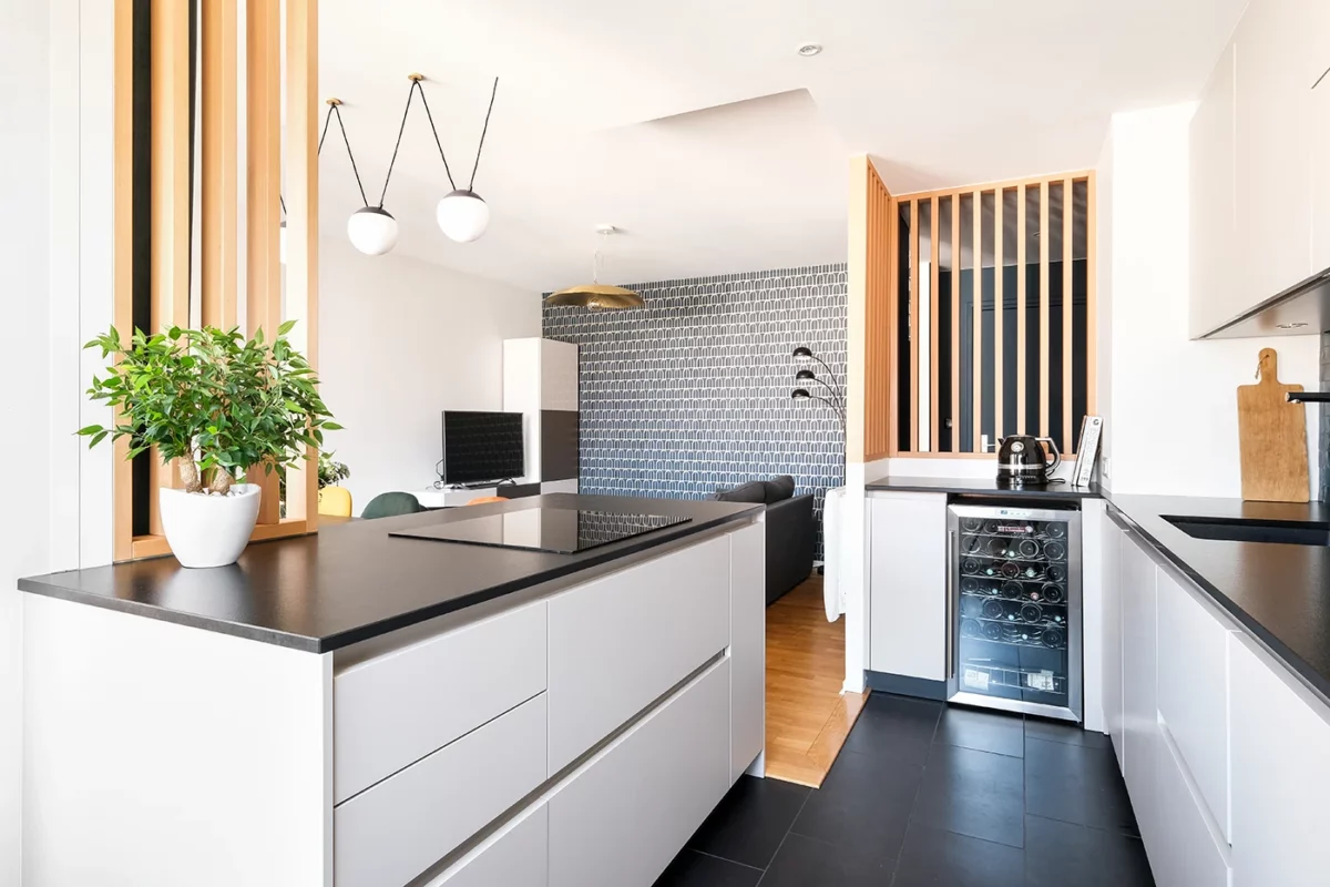 Grâce à cette rénovation, chaque recoin de l’appartement a été optimisé pour répondre aux besoins de ses occupants. L’entrée donne immédiatement le ton d’un lieu convivial et élégant, la cuisine ouverte invite au partage, tandis que le salon baigné de lumière offre un véritable cocon de détente.