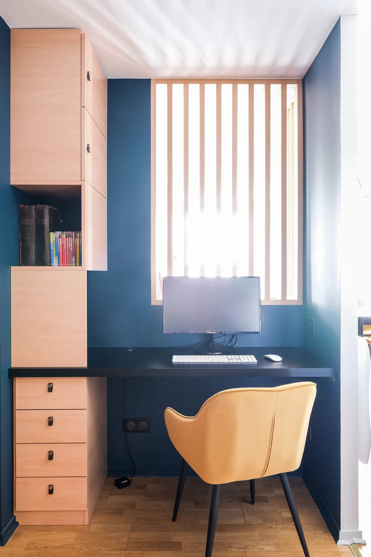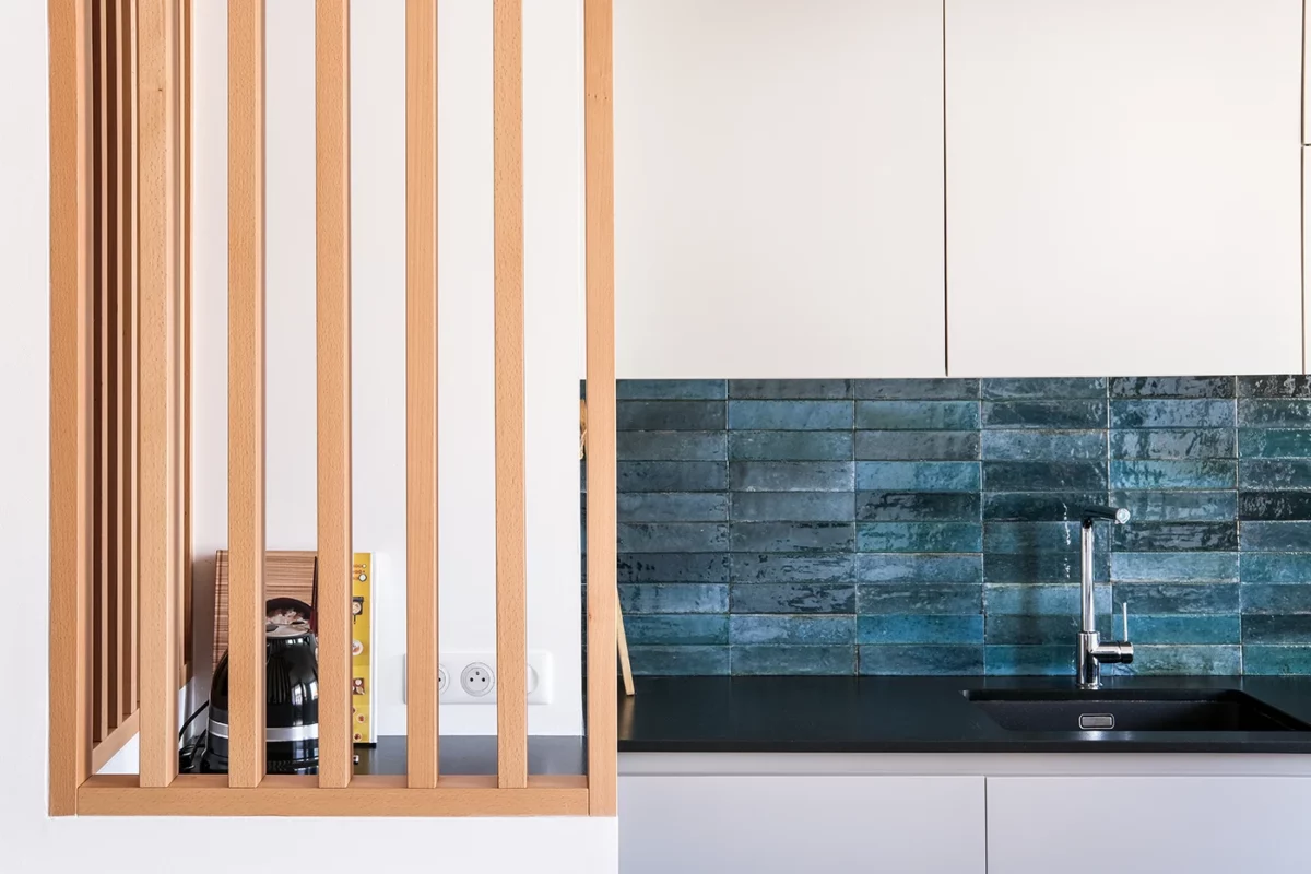 Découvrez comment l’alliance du bleu canard et du bois a transformé cet appartement du quartier de la Guillotière en un espace fonctionnel, baigné de lumière et plein de caractère