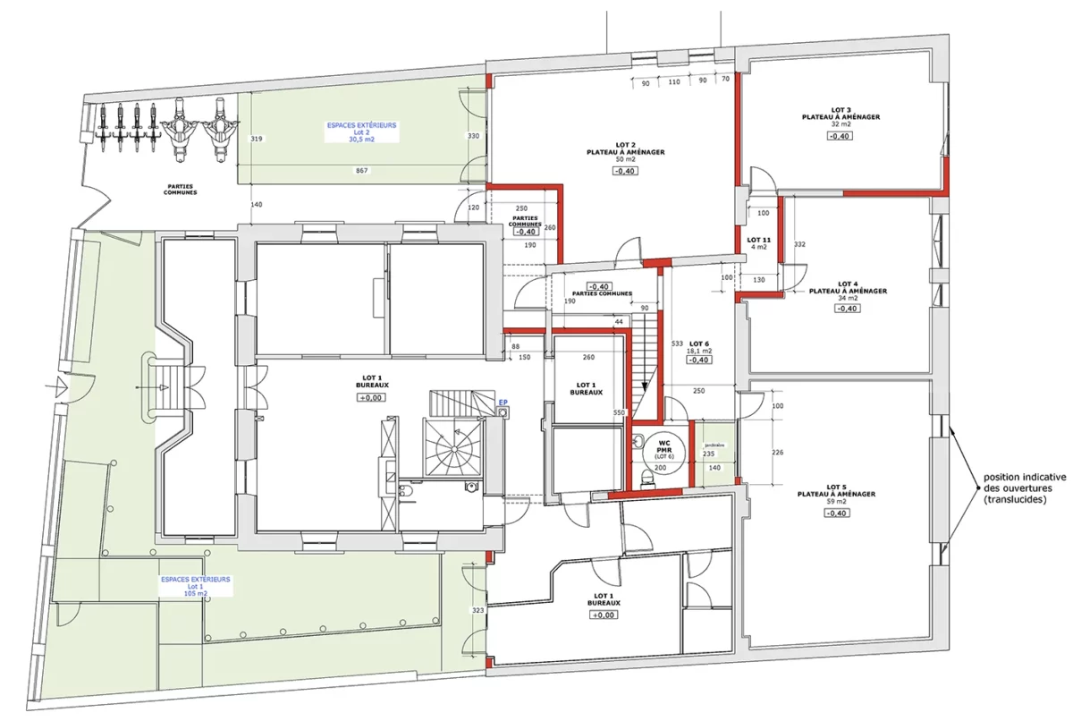 - Optimisation de la luminosité: création d’ouvertures translucides au rez-de-chaussée, apportant lumière naturelle et intimité dans les plateaux à aménager.