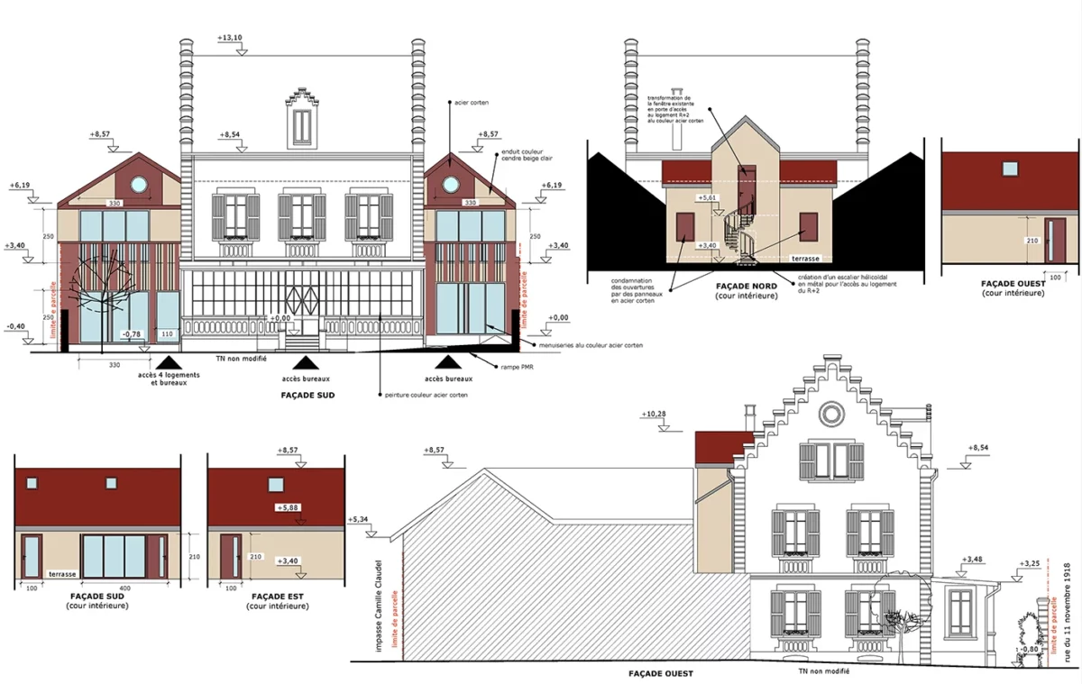- Modernisation des espaces intérieurs: intégration d’équipements contemporains et de nouvelles circulations pour répondre aux exigences actuelles, notamment avec l’ajout d’un escalier hélicoïdal pour desservir les logements en étage.