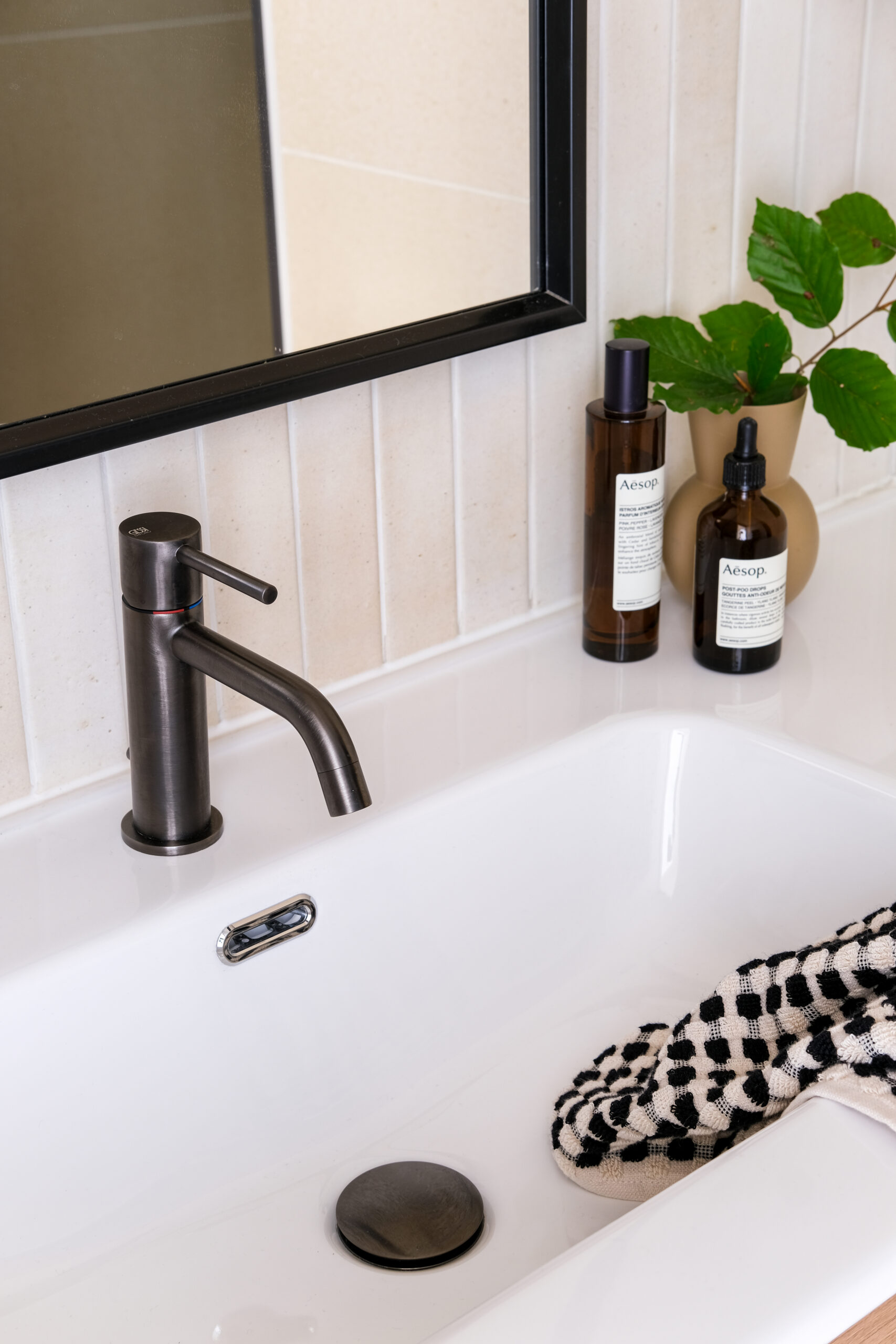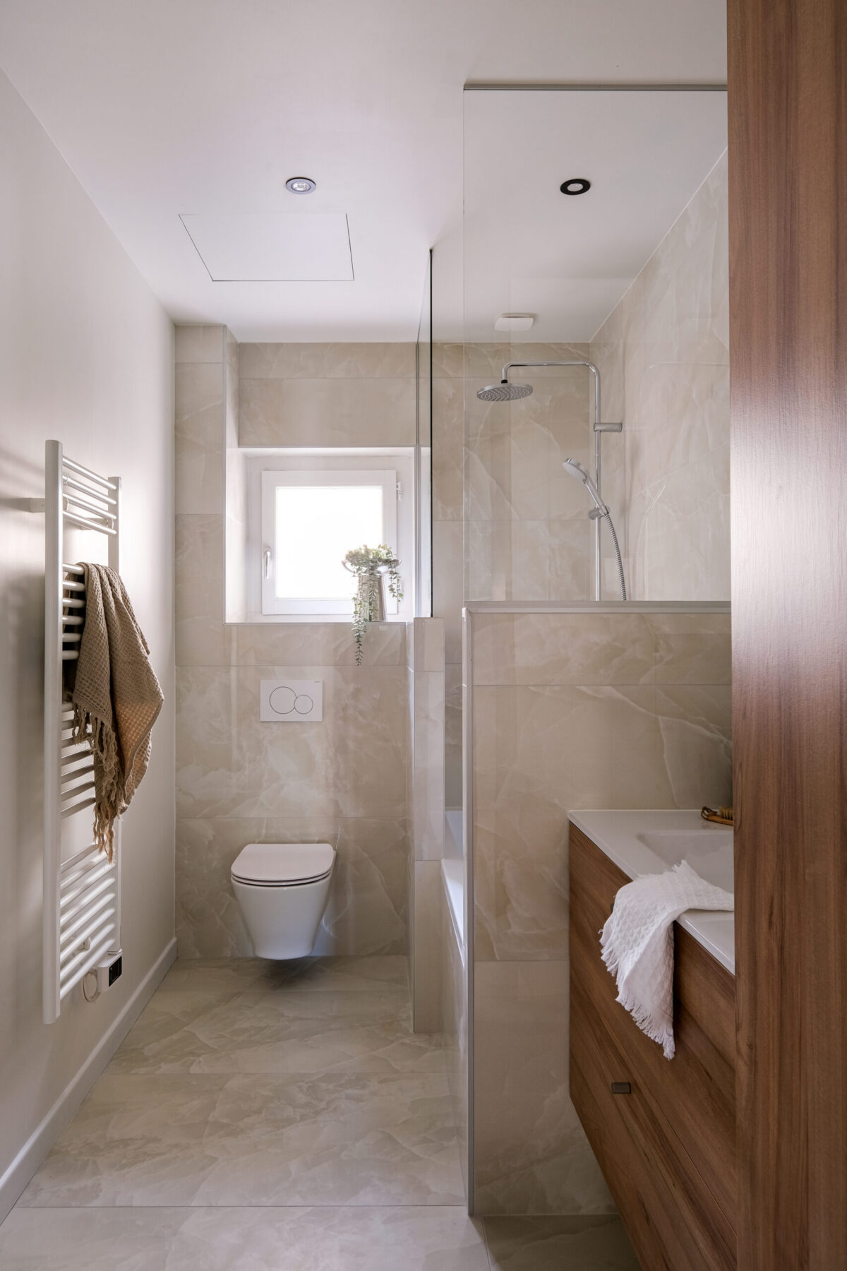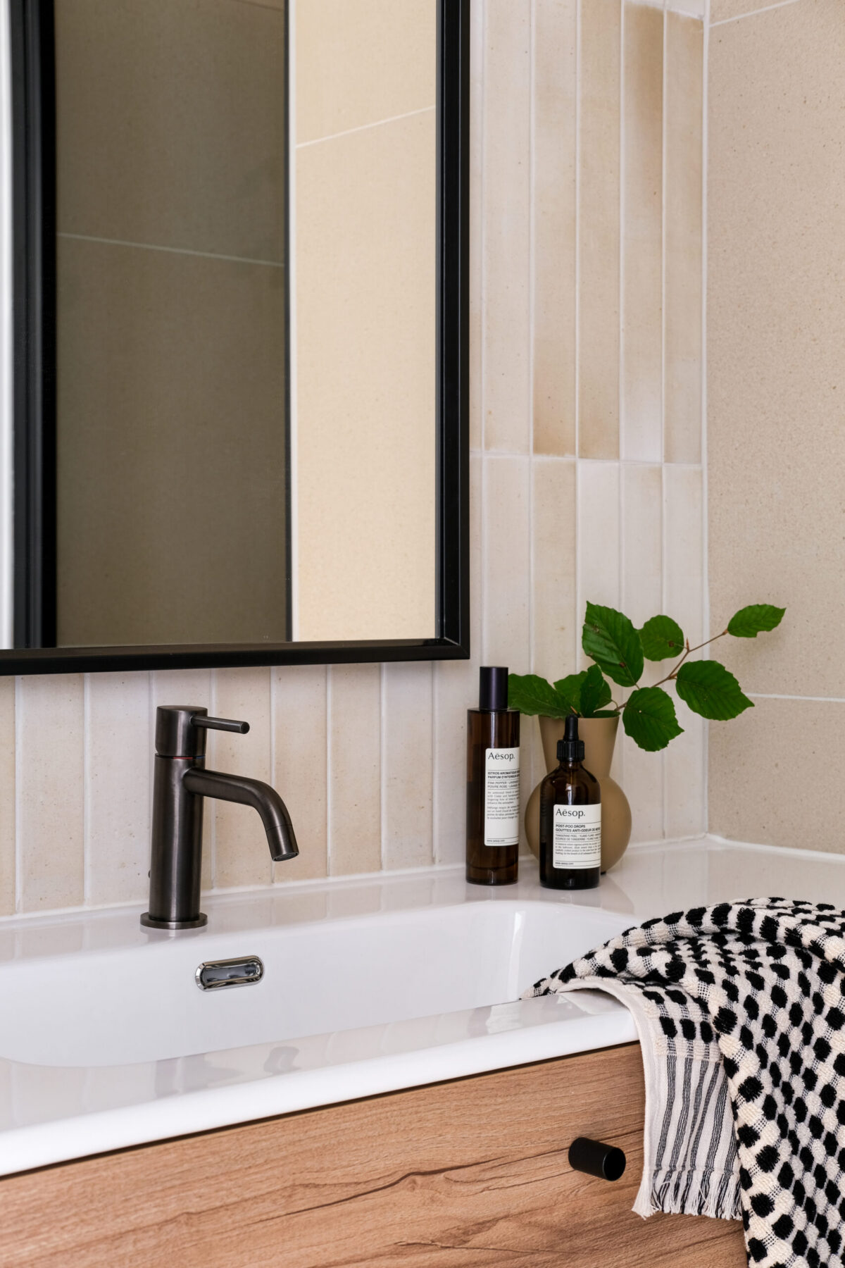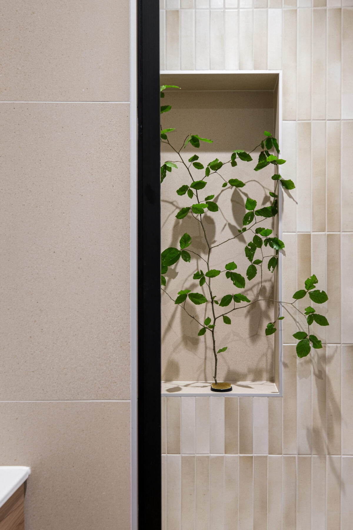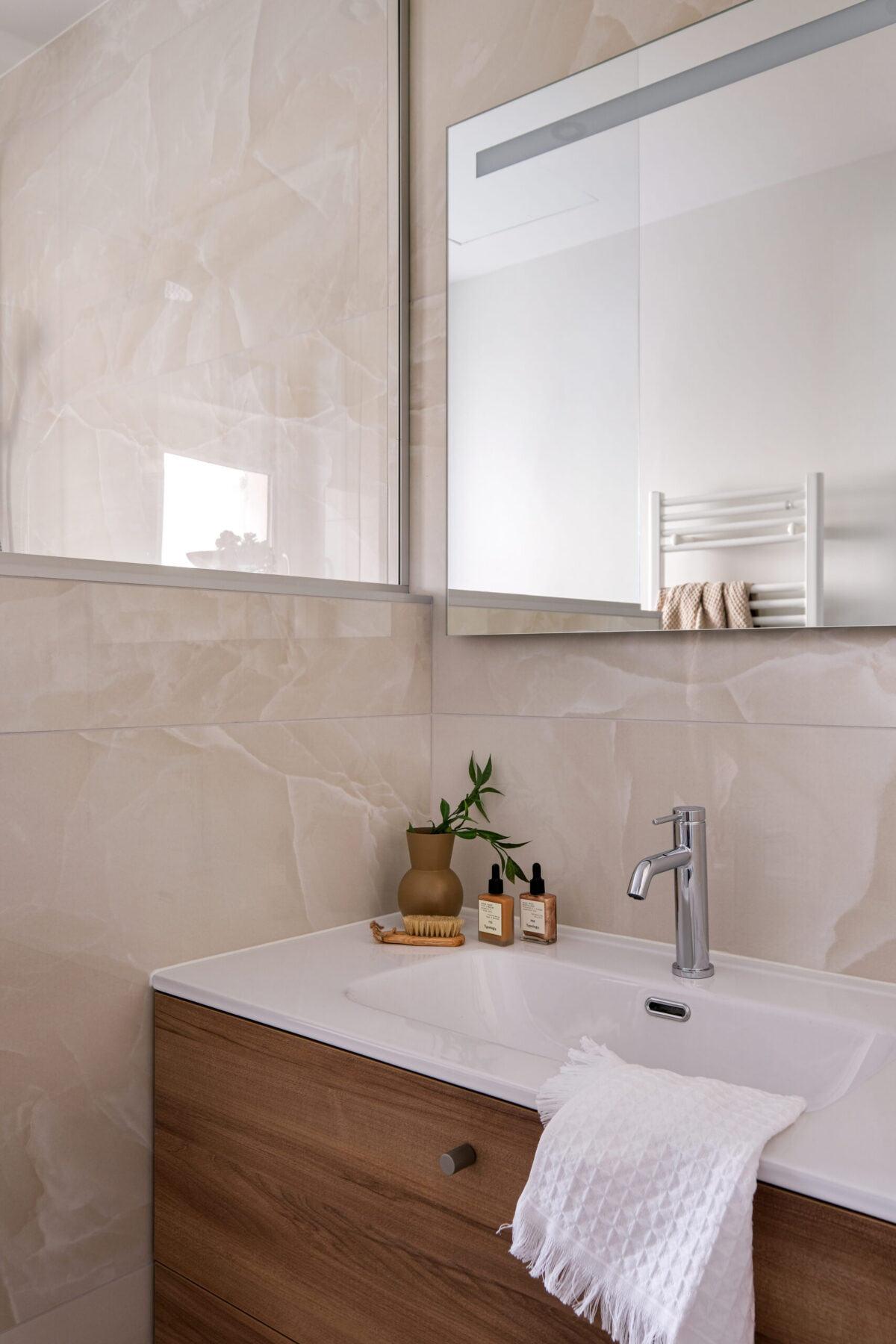 Les pièces d’eau, plus minérales, misent sur la sobriété : onyx couleur crème, bois clair et touches noires graphiques pour une élégance contemporaine.