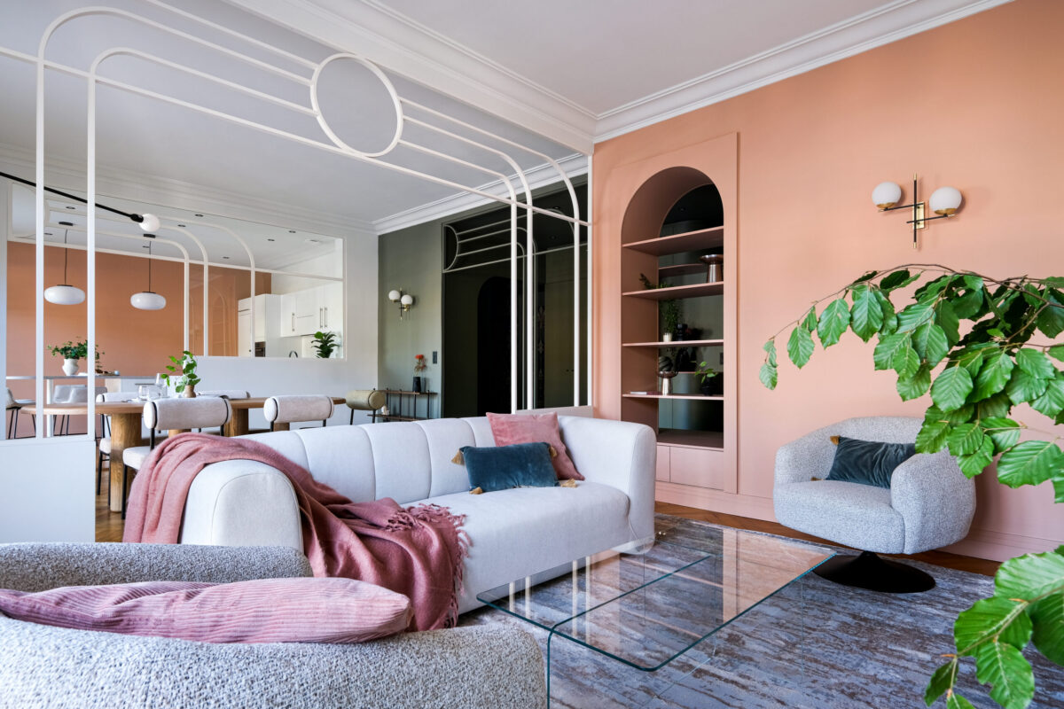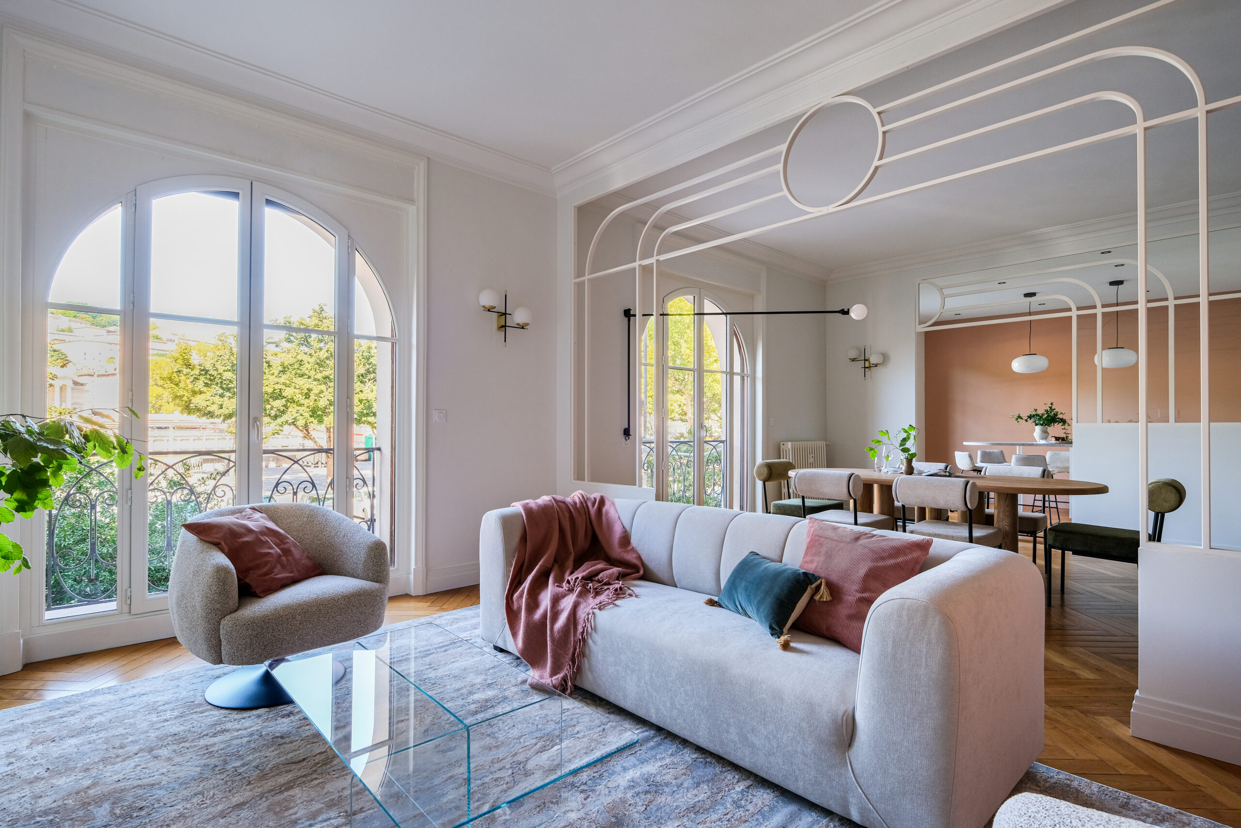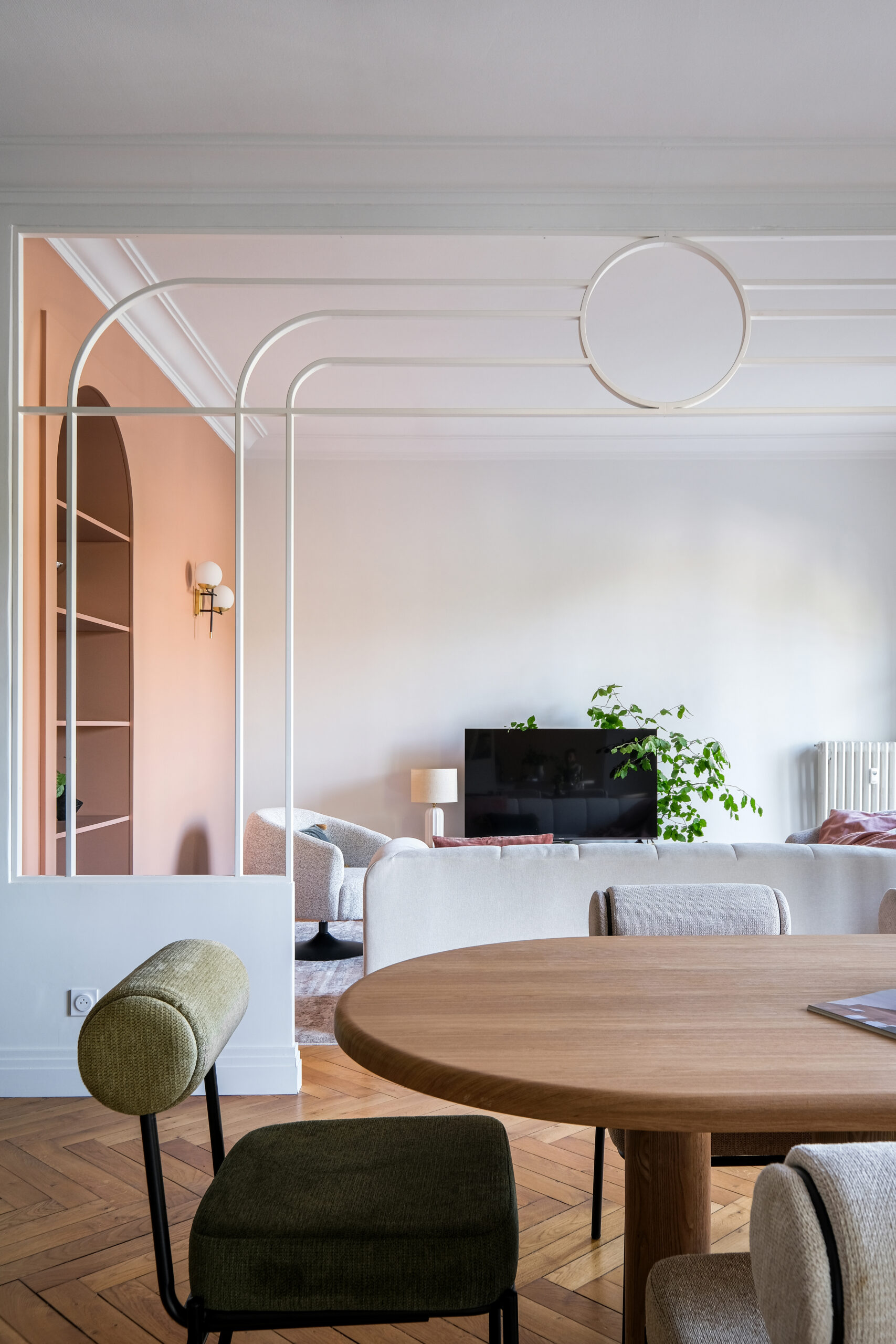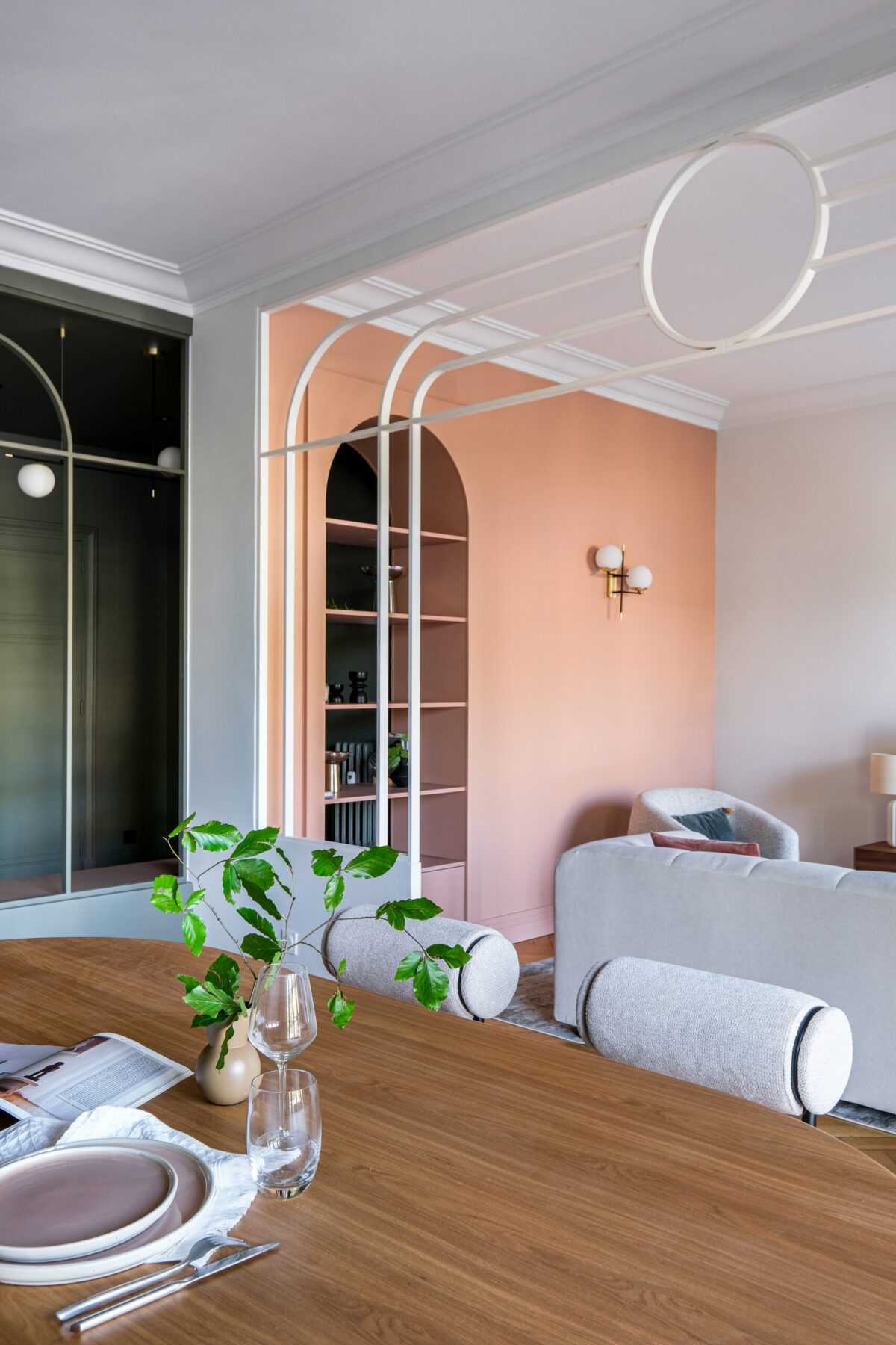 Dans le séjour, les arches et cercles métalliques redessinent l’espace sans l’alourdir, tandis qu’une banquette intégrée et un mobilier sur mesure structurent la pièce avec douceur.