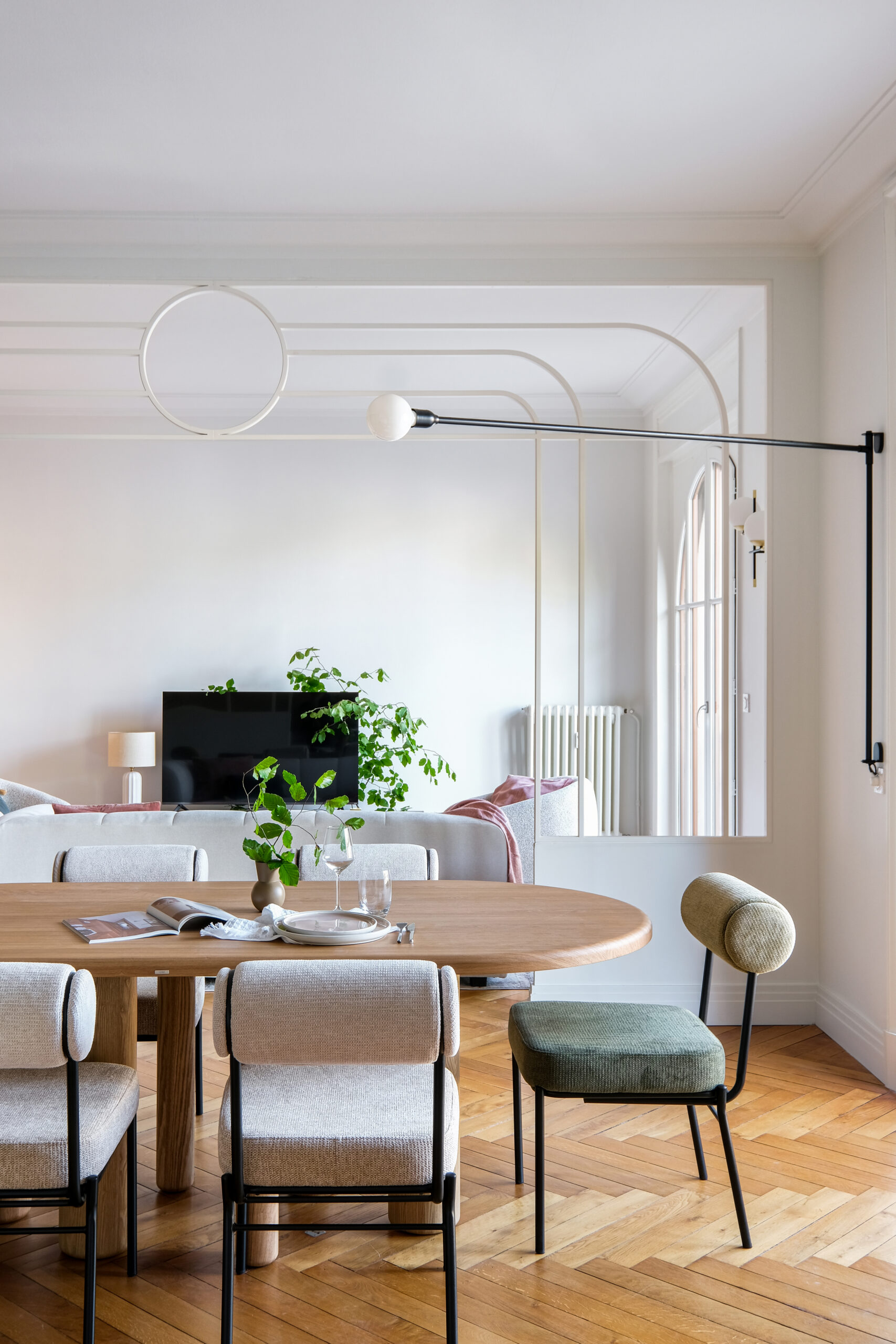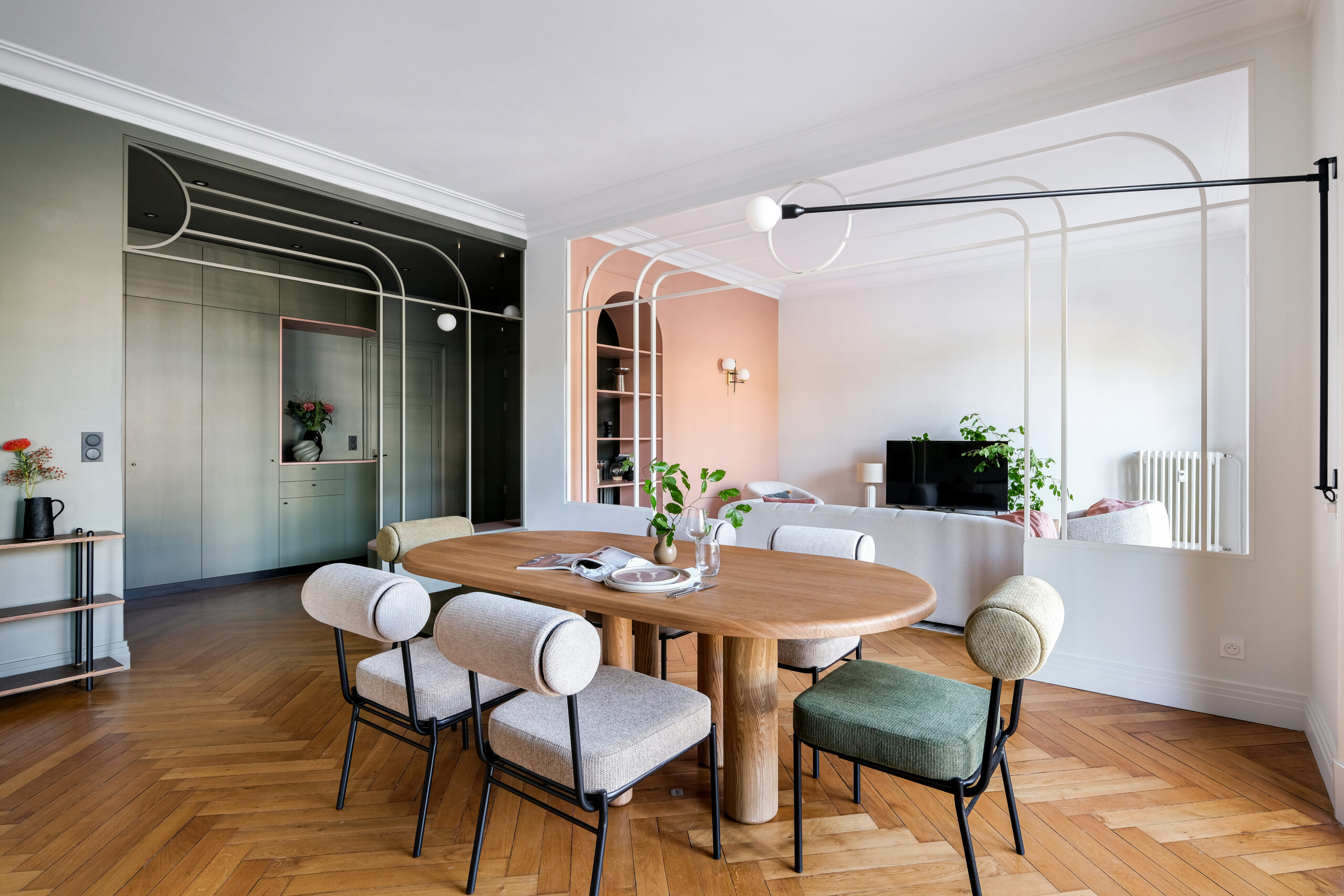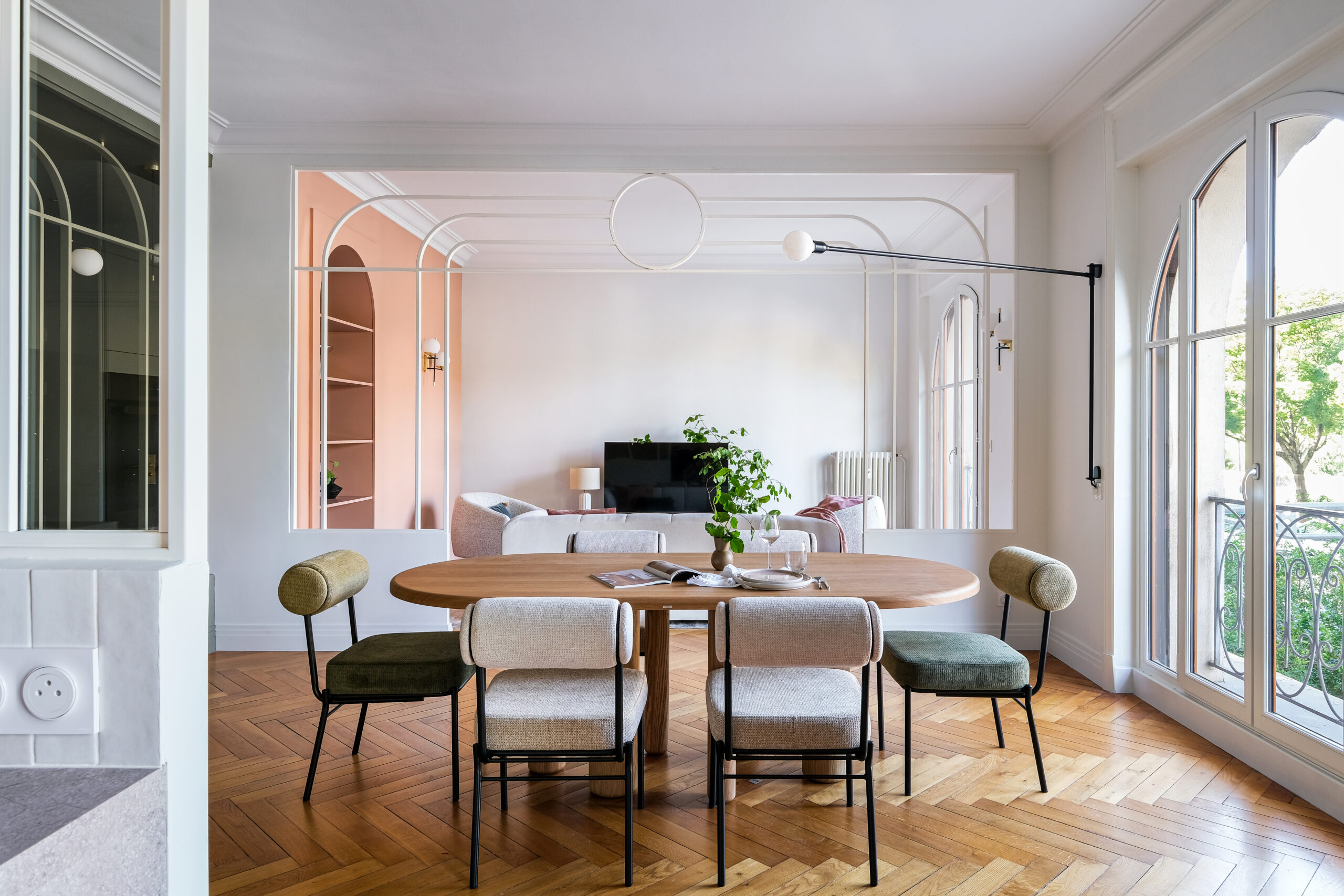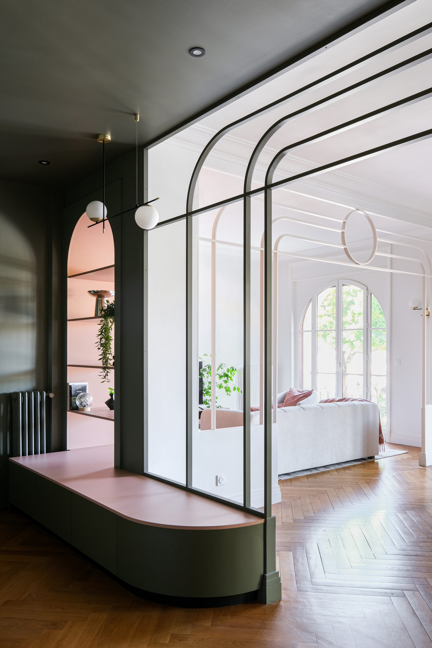 Dans le séjour, les arches et cercles métalliques redessinent l’espace sans l’alourdir, tandis qu’une banquette intégrée et un mobilier sur mesure structurent la pièce avec douceur.