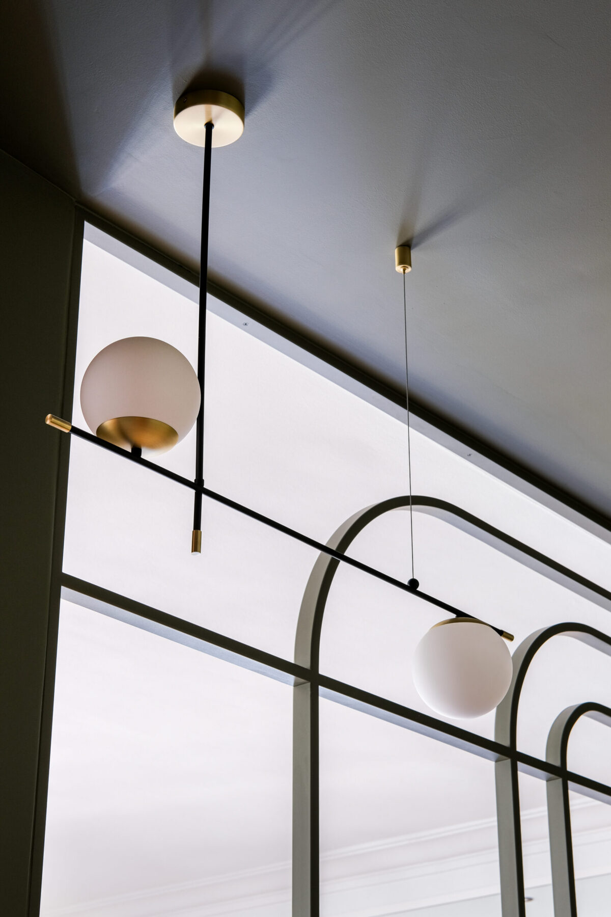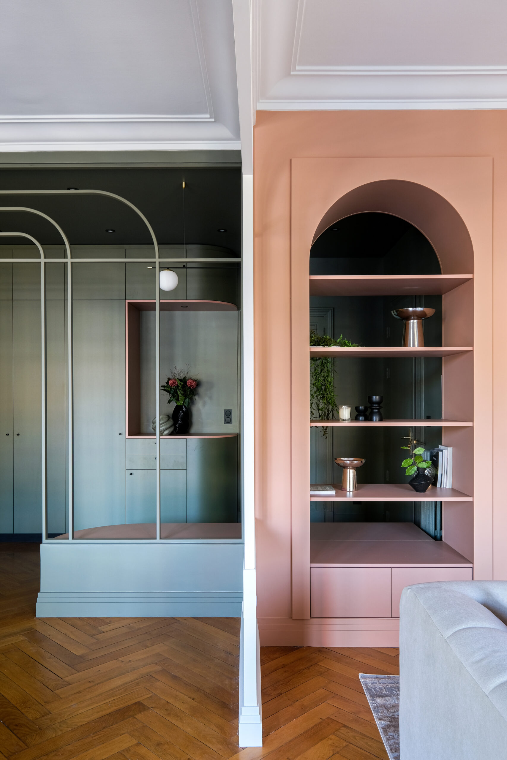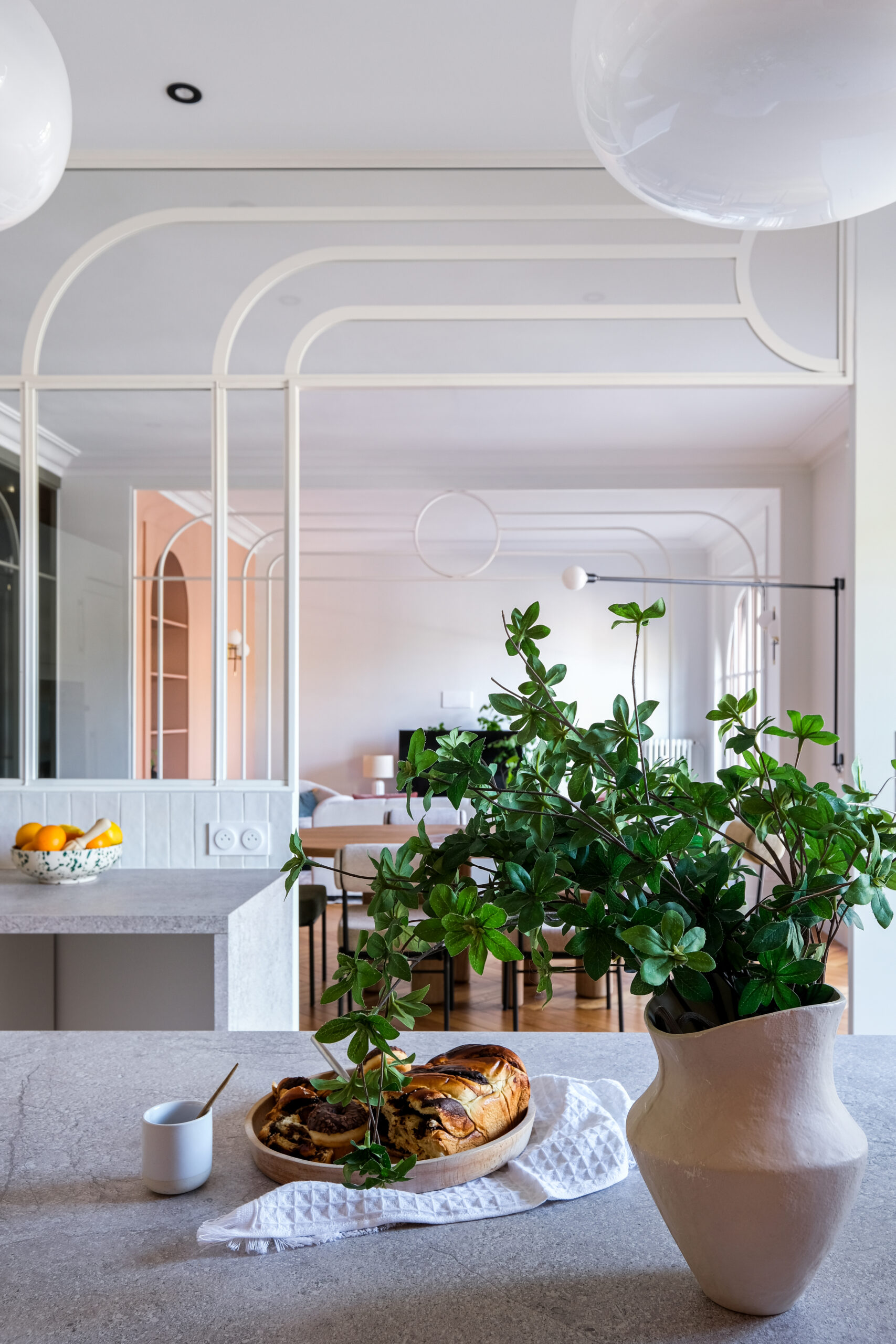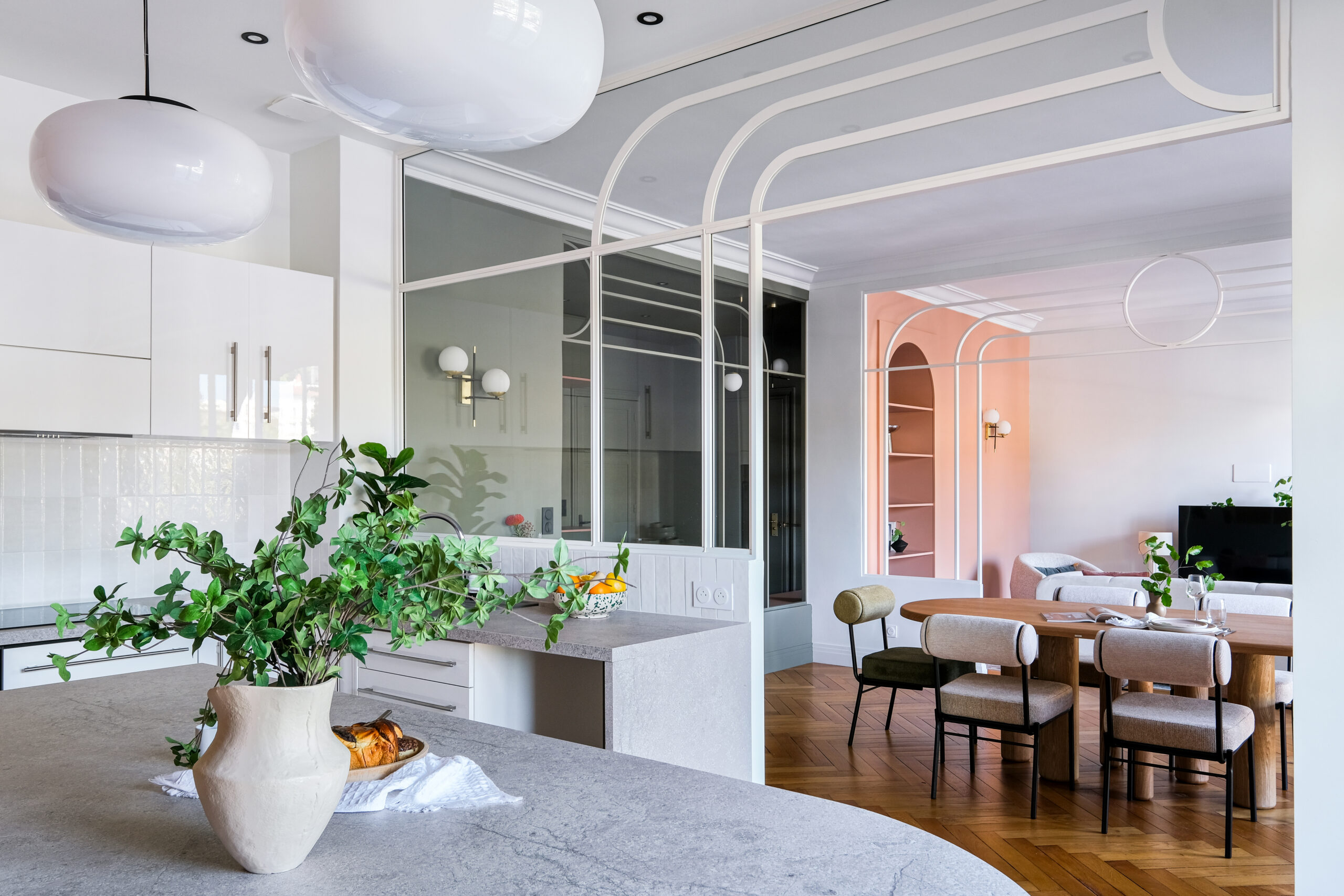 Dans le séjour, les arches et cercles métalliques redessinent l’espace sans l’alourdir, tandis qu’une banquette intégrée et un mobilier sur mesure structurent la pièce avec douceur.