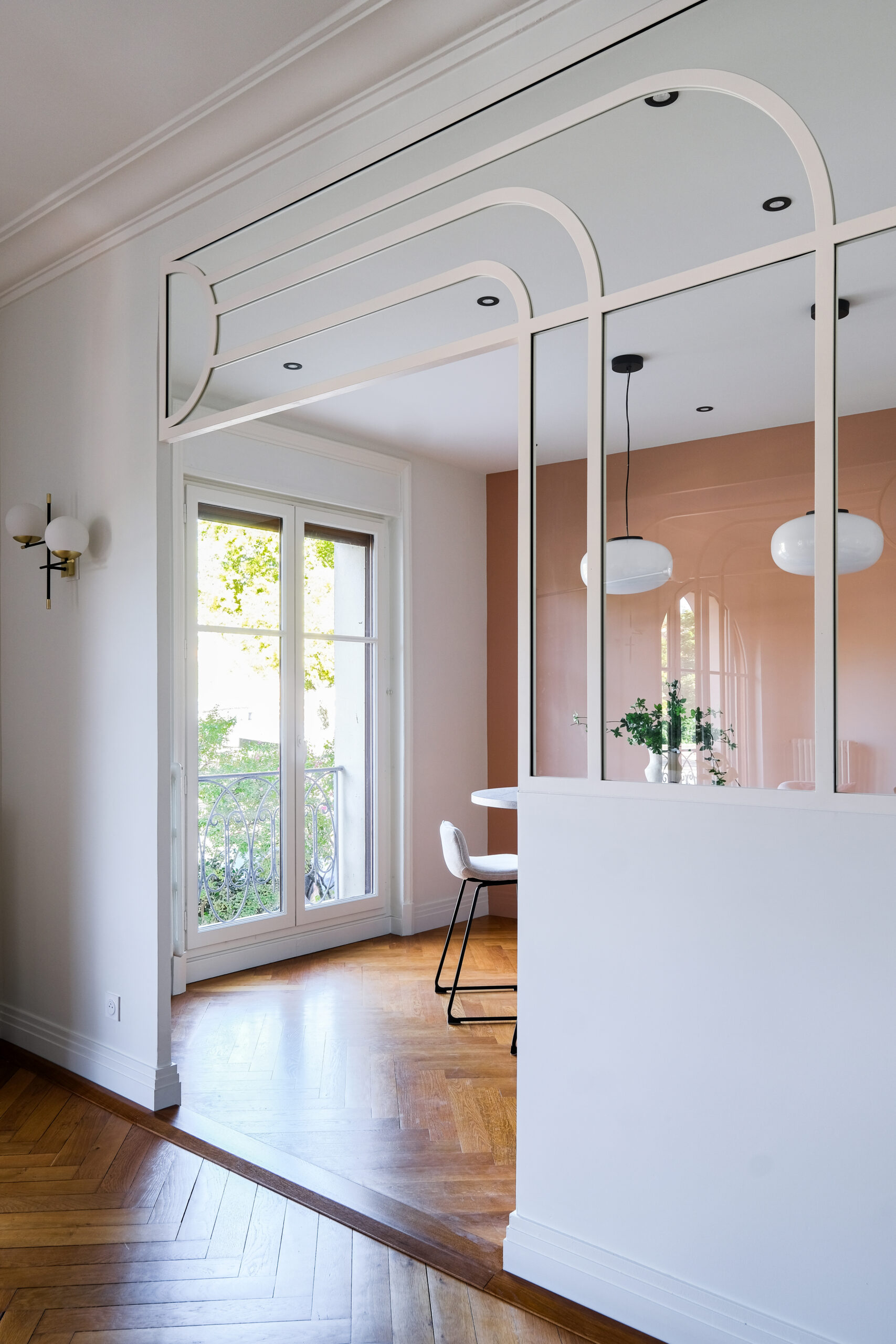 - Structure métallique dessinée sur mesure, évoquant les verrières anciennes et prolongeant les perspectives.