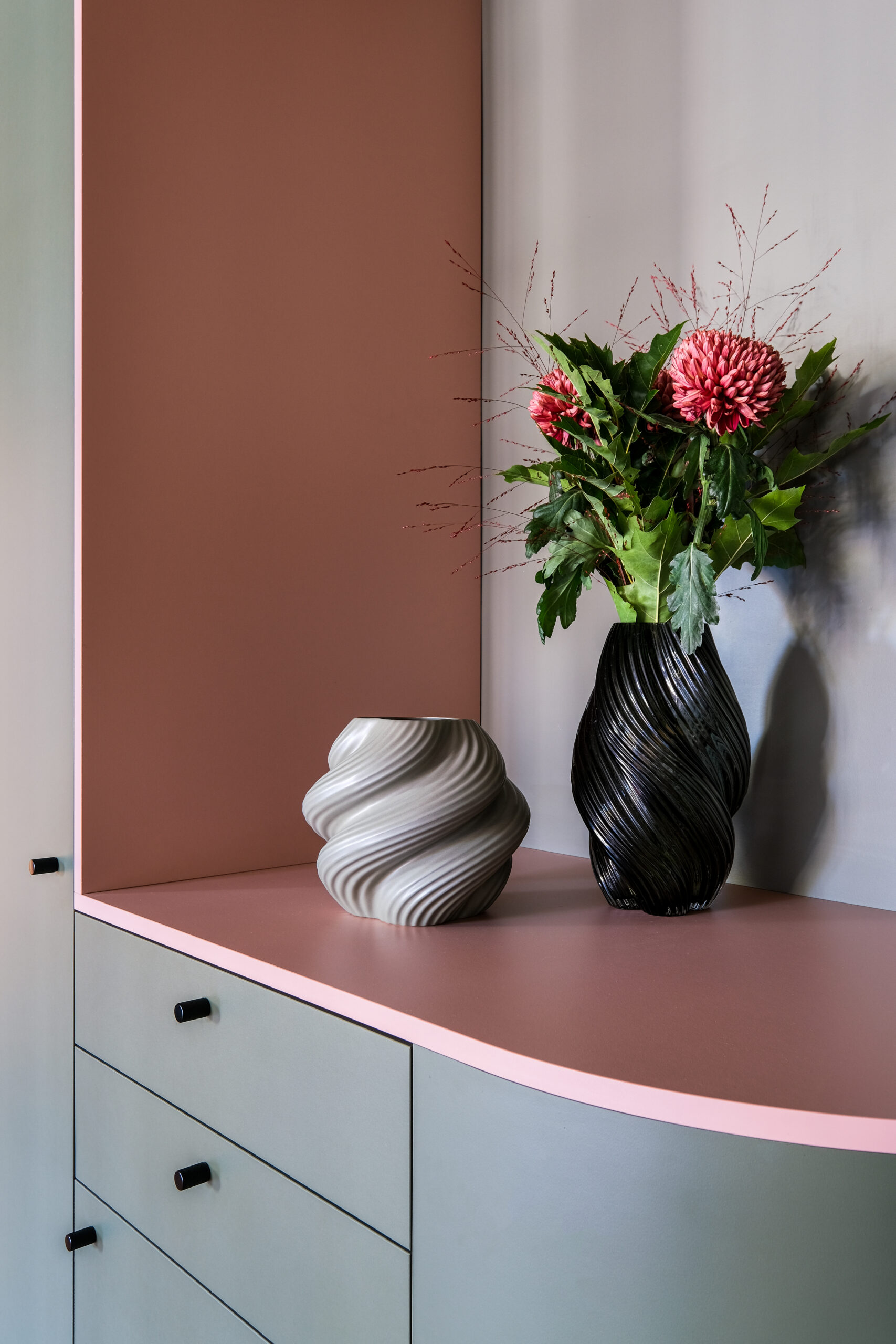- Palette chromatique subtile : un vert répond à un rose cuivré poudré, dans un équilibre évoquant les teintes automnales.