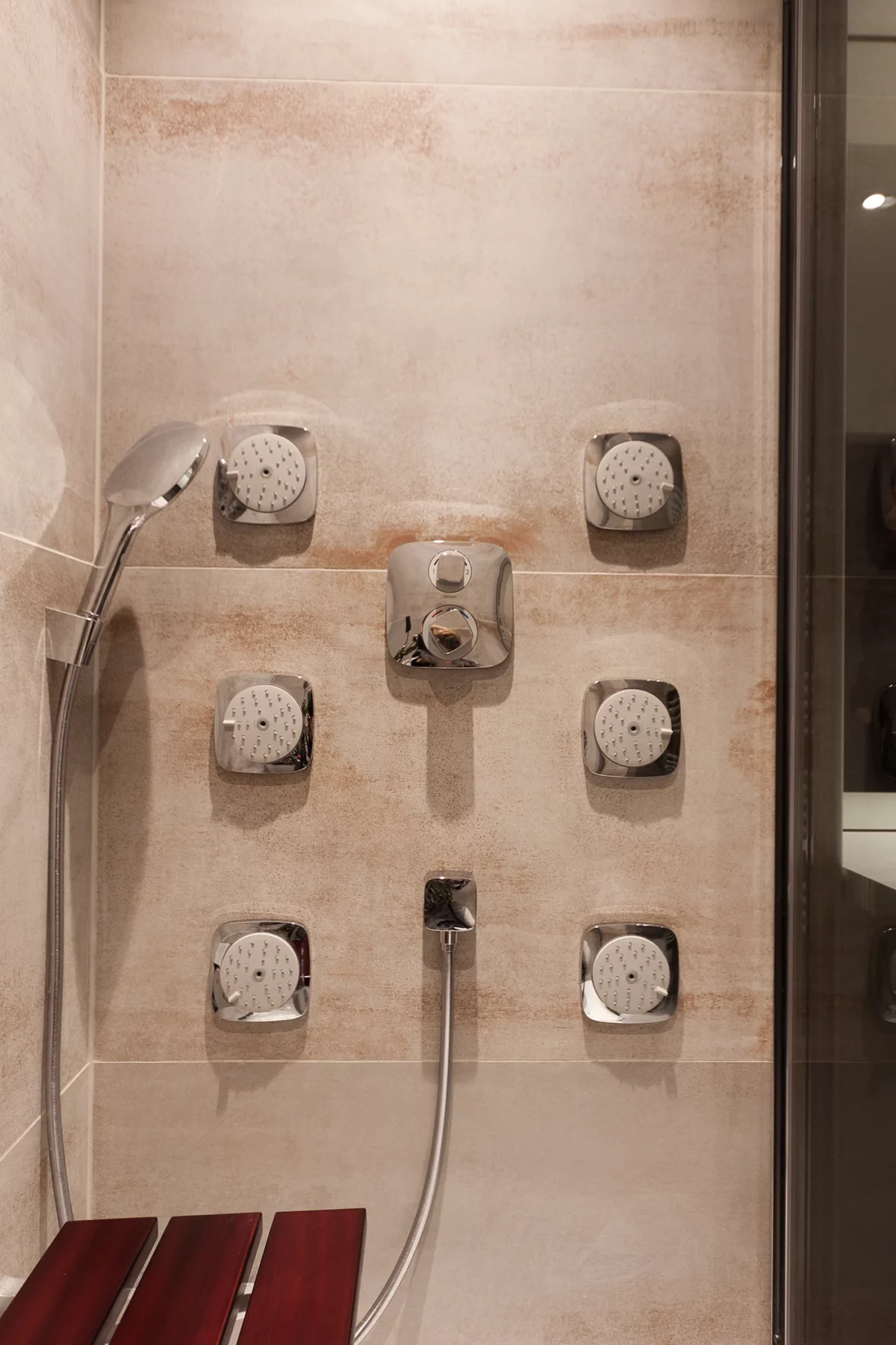 La salle de bain est un espace de bien-être conçu pour le confort et la relaxation. Équipée d’une douche à jets intégrés, d’un banc en bois et de matériaux naturels, elle offre un design à la fois pratique et esthétique.
