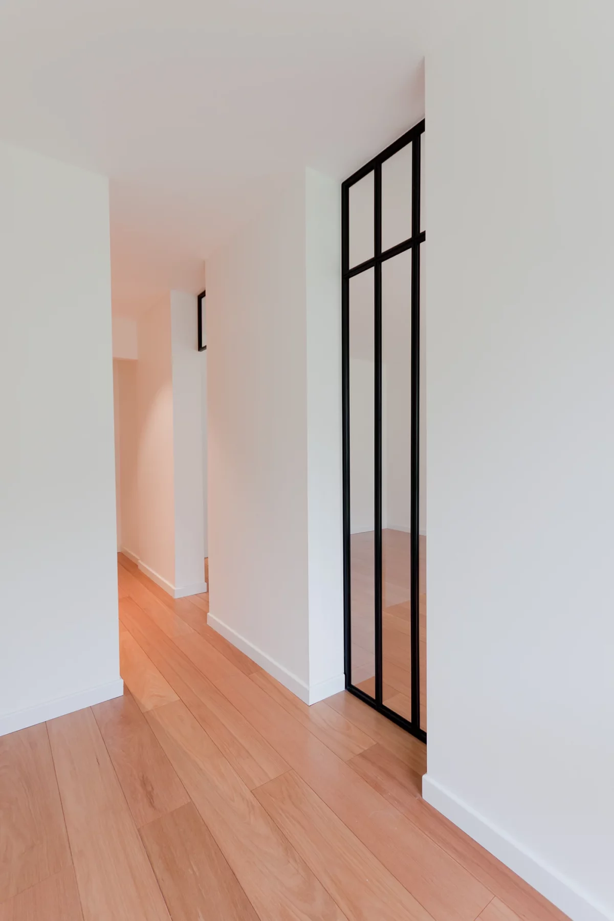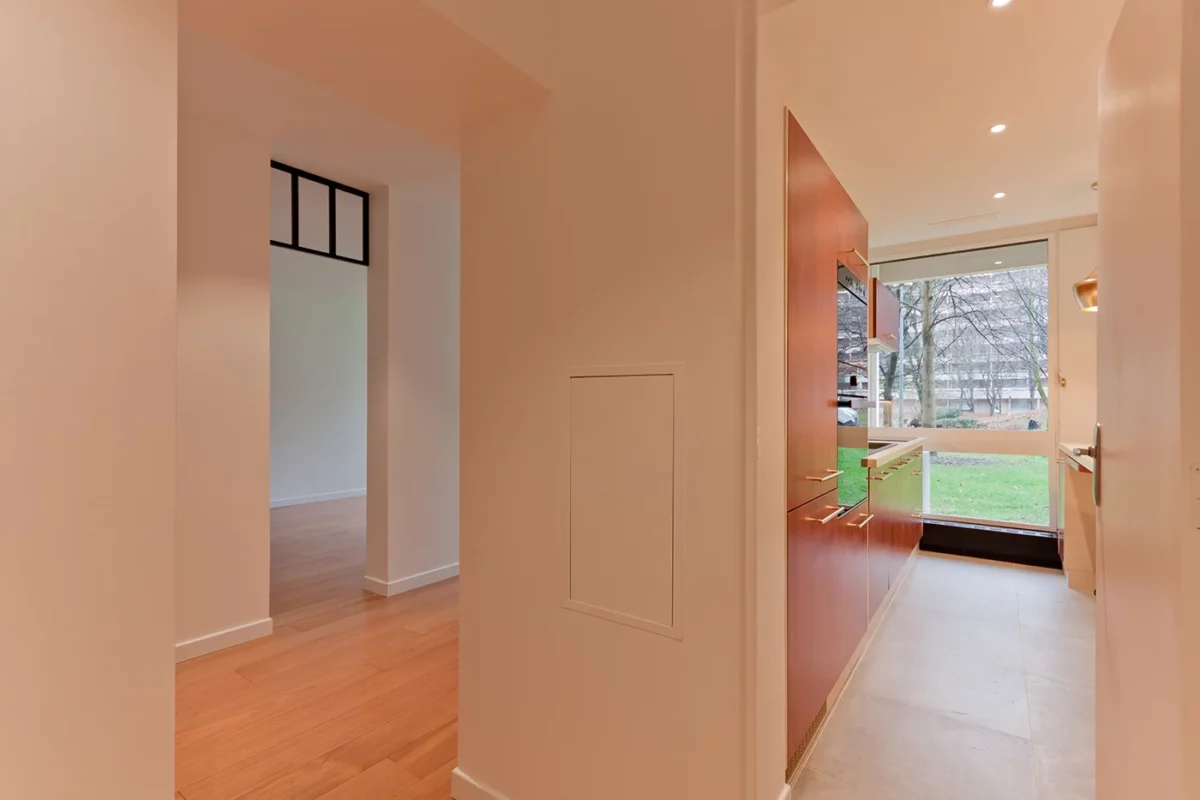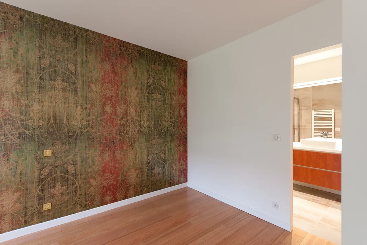 Le choix des matériaux nobles, comme le parquet en bois clair et le papier peint décoratif, confère une profondeur visuelle et une ambiance chaleureuse. Les grandes ouvertures et la lumière naturelle mettent en valeur ces éléments, tout en créant un cadre apaisant.