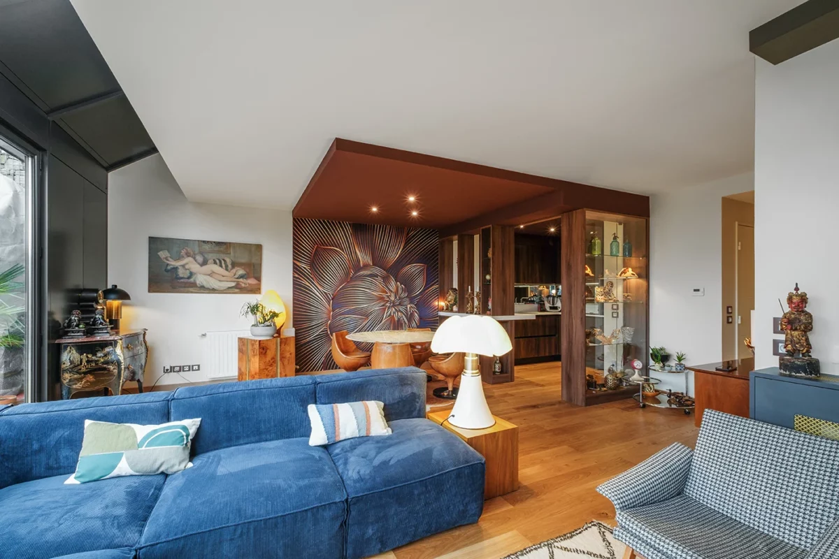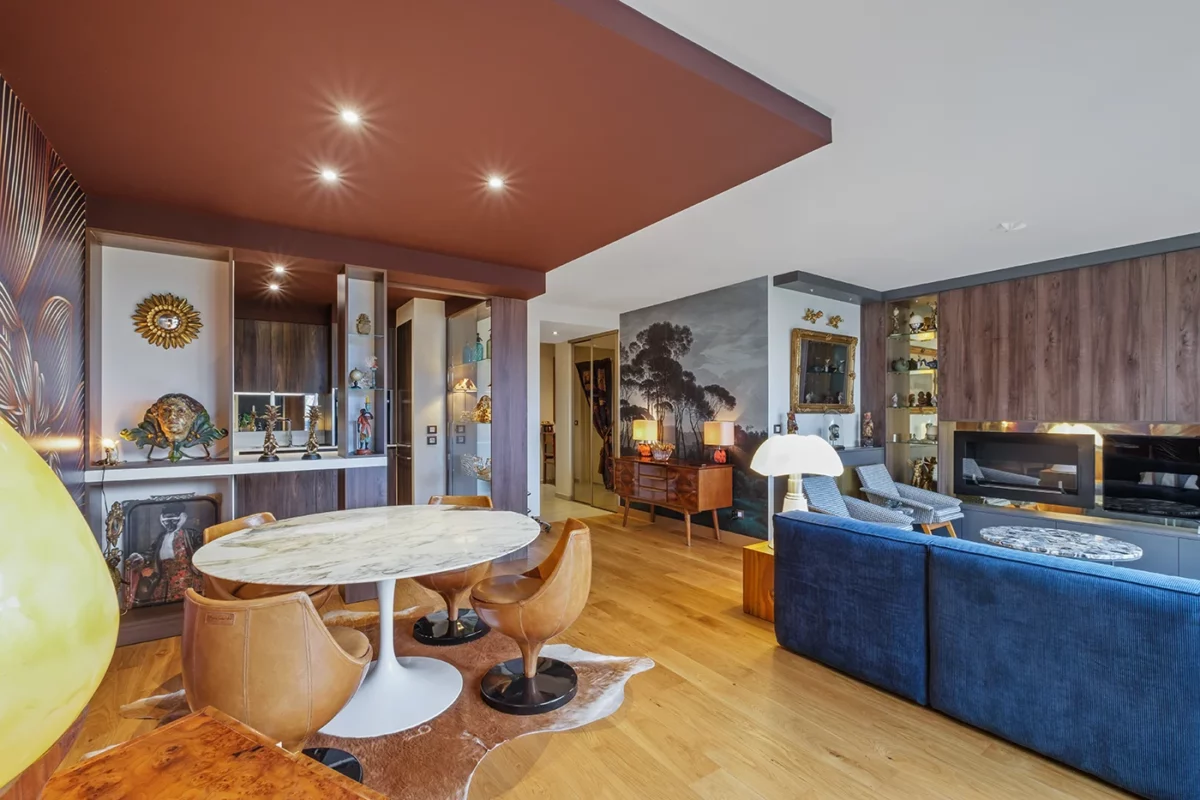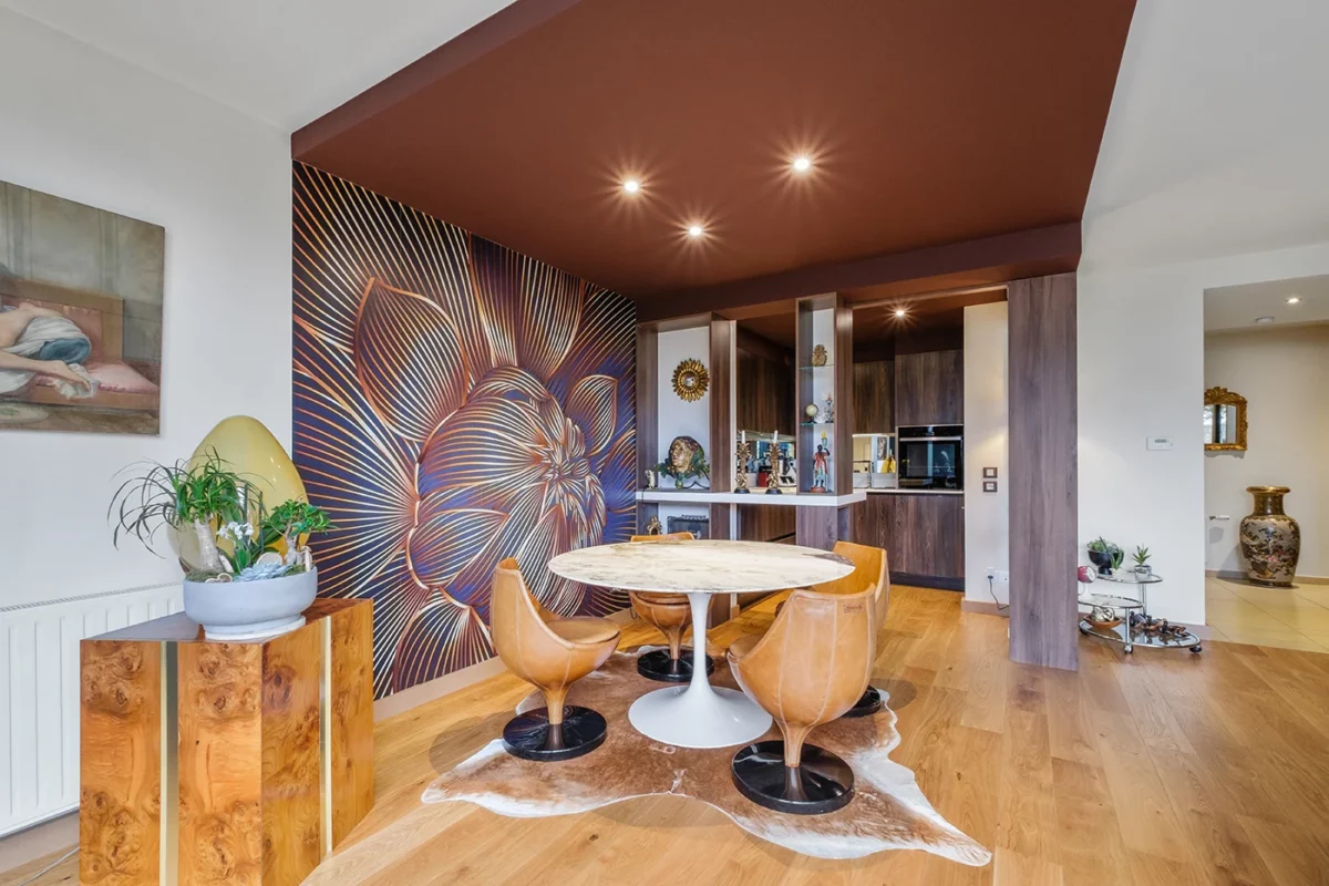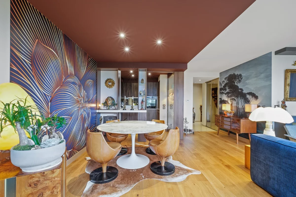 Dans cet appartement lyonnais situé dans un immeuble contemporain, l’enjeu consistait à transformer un espace unique en deux zones distinctes : d’un côté, une cuisine contemporaine et fonctionnelle ; de l’autre, un séjour chaleureux et propice à la détente. Pour créer un espace dînatoire convivial, nous avons imaginé un faux-plafond qui délimite visuellement la salle à manger, mettant en valeur la table et les fauteuils tout en donnant une ambiance feutrée. Le choix d’un papier peint graphique et d’un parquet en bois clair a permis d’apporter de la chaleur et du caractère, offrant ainsi une transition douce entre la cuisine et le salon.