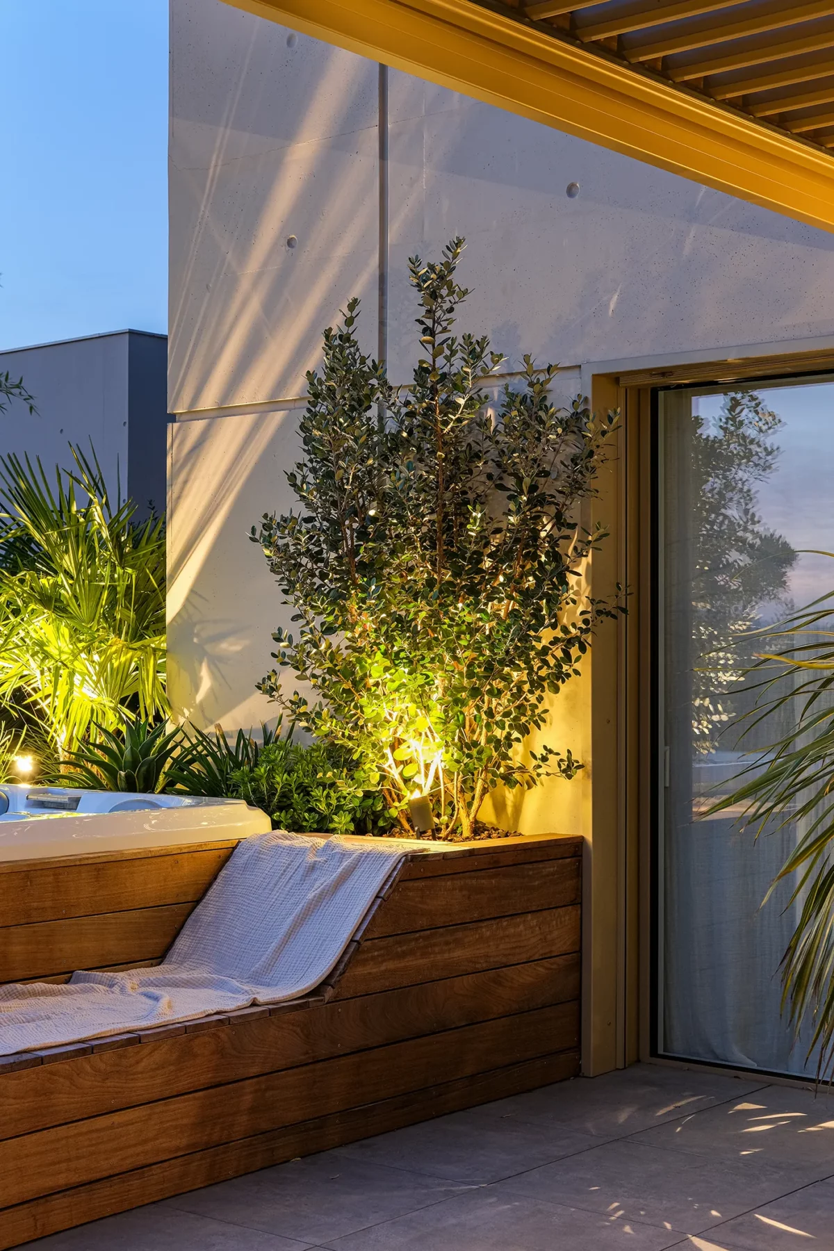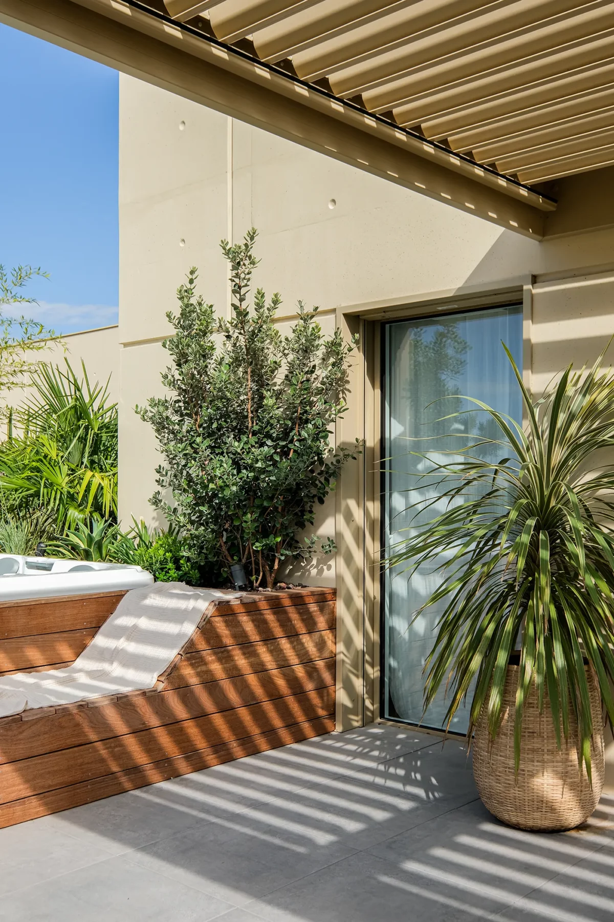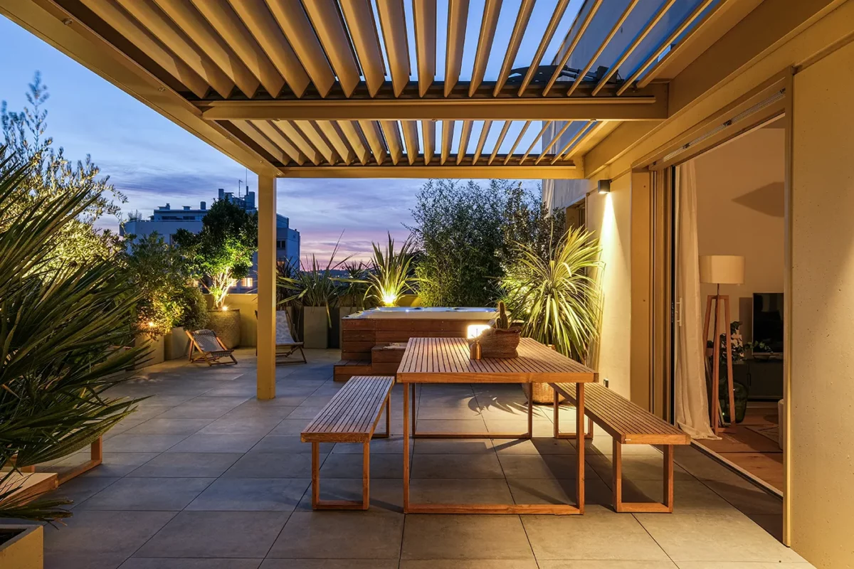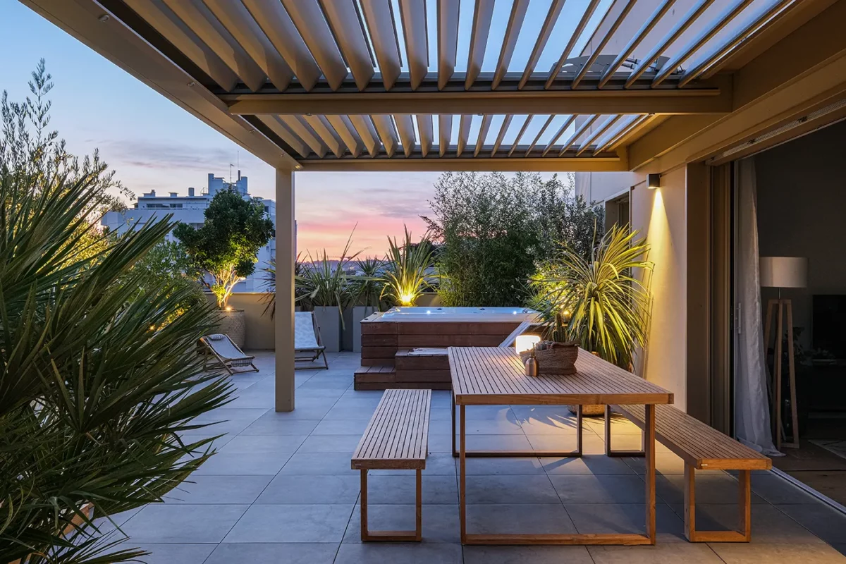 - Une pergola bioclimatique pour se protéger du soleil ou de la pluie.