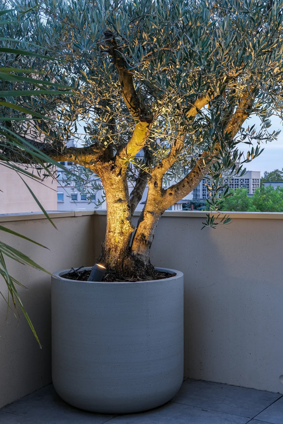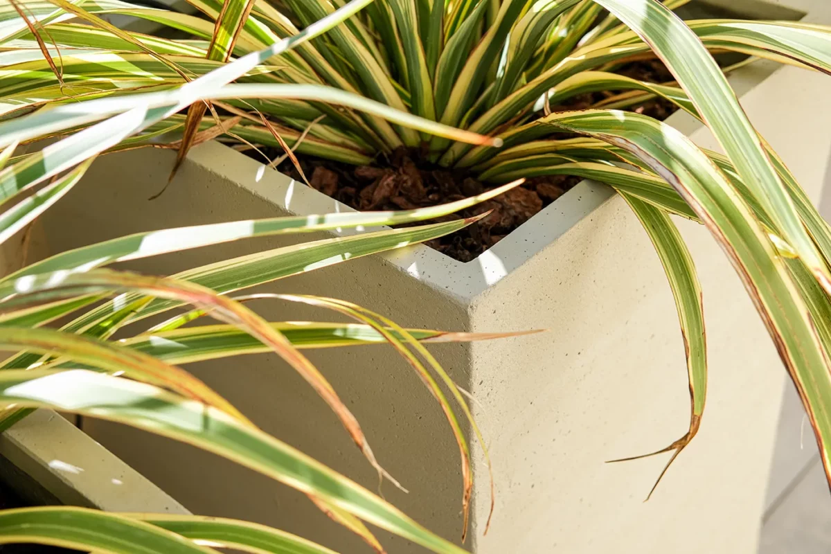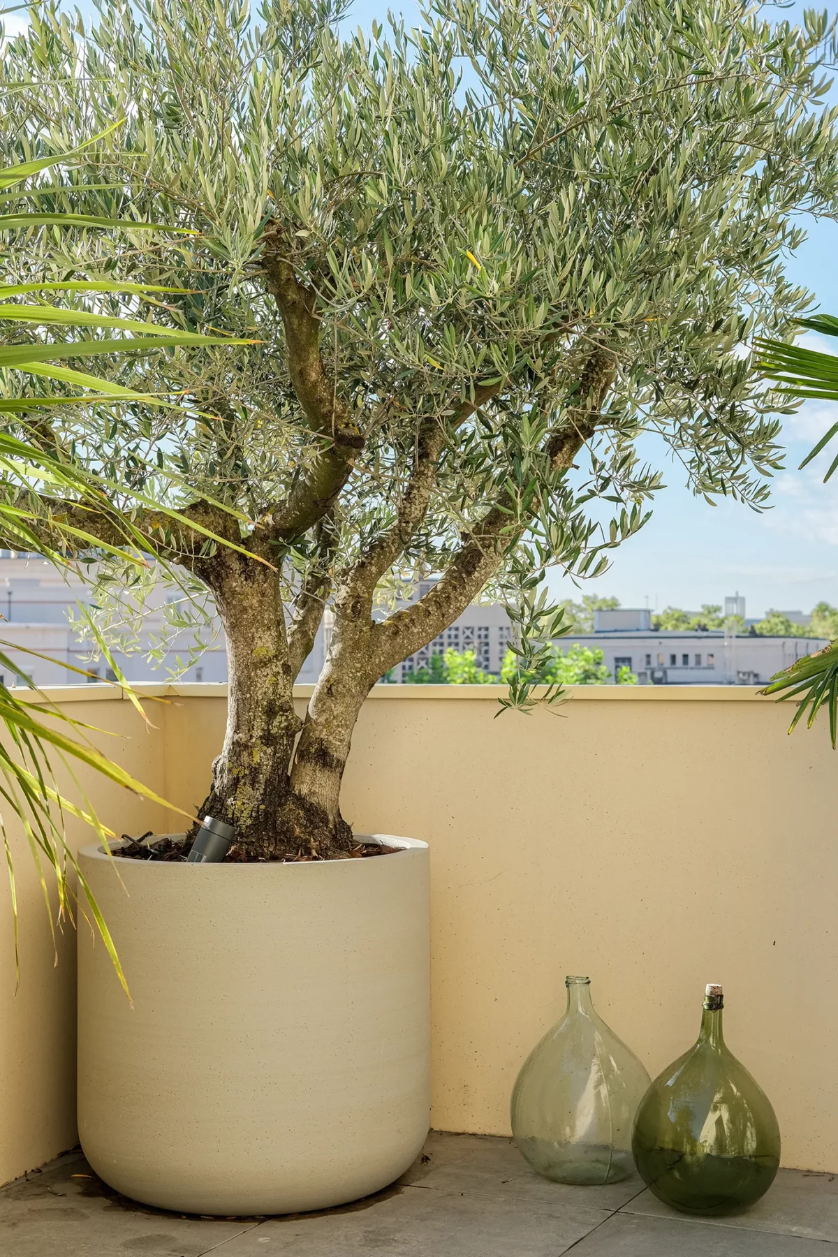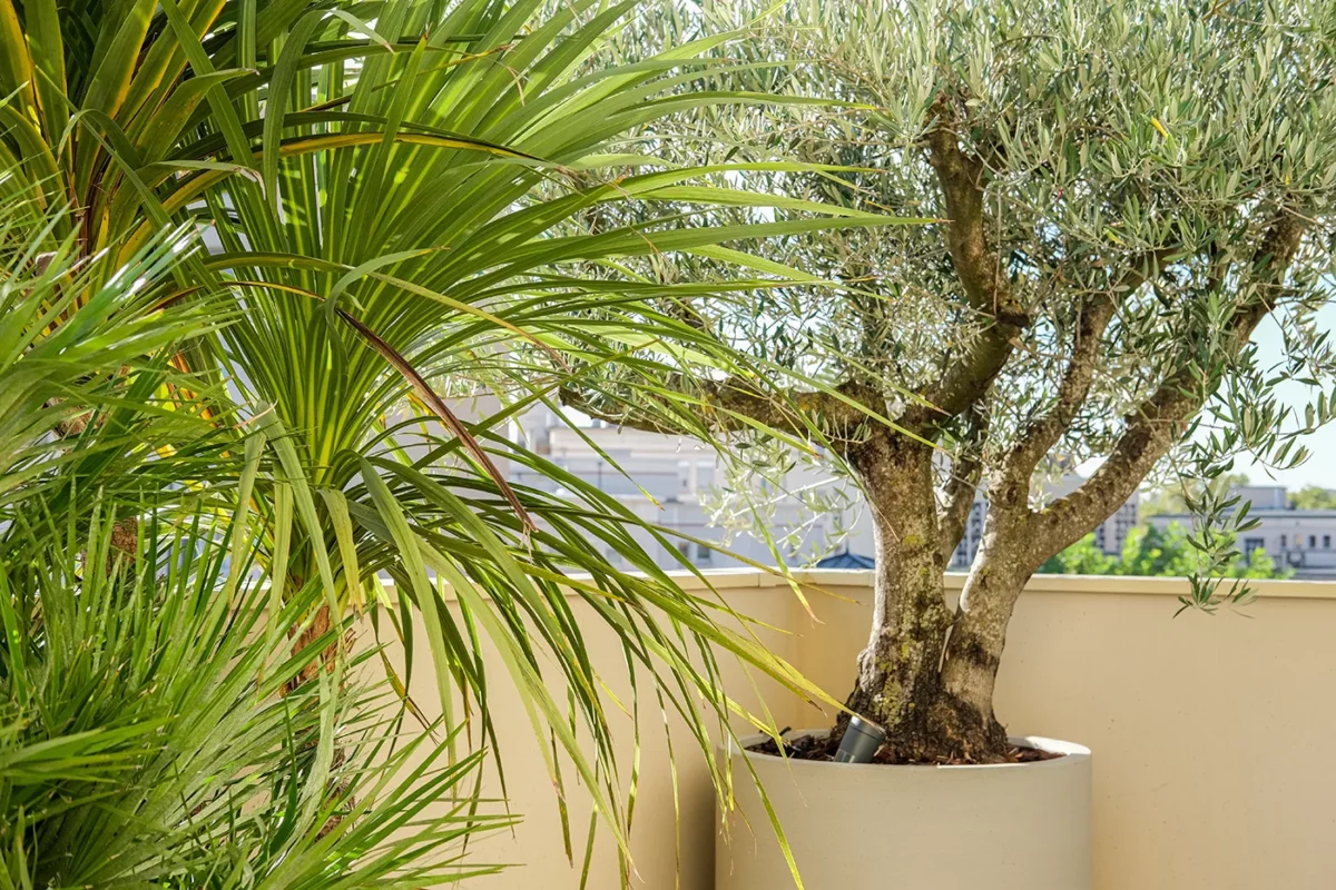 Pour une atmosphère chaleureuse et apaisante, le choix des pots aux tons neutres s’harmonise avec l’architecture moderne. La sélection végétale comprend :