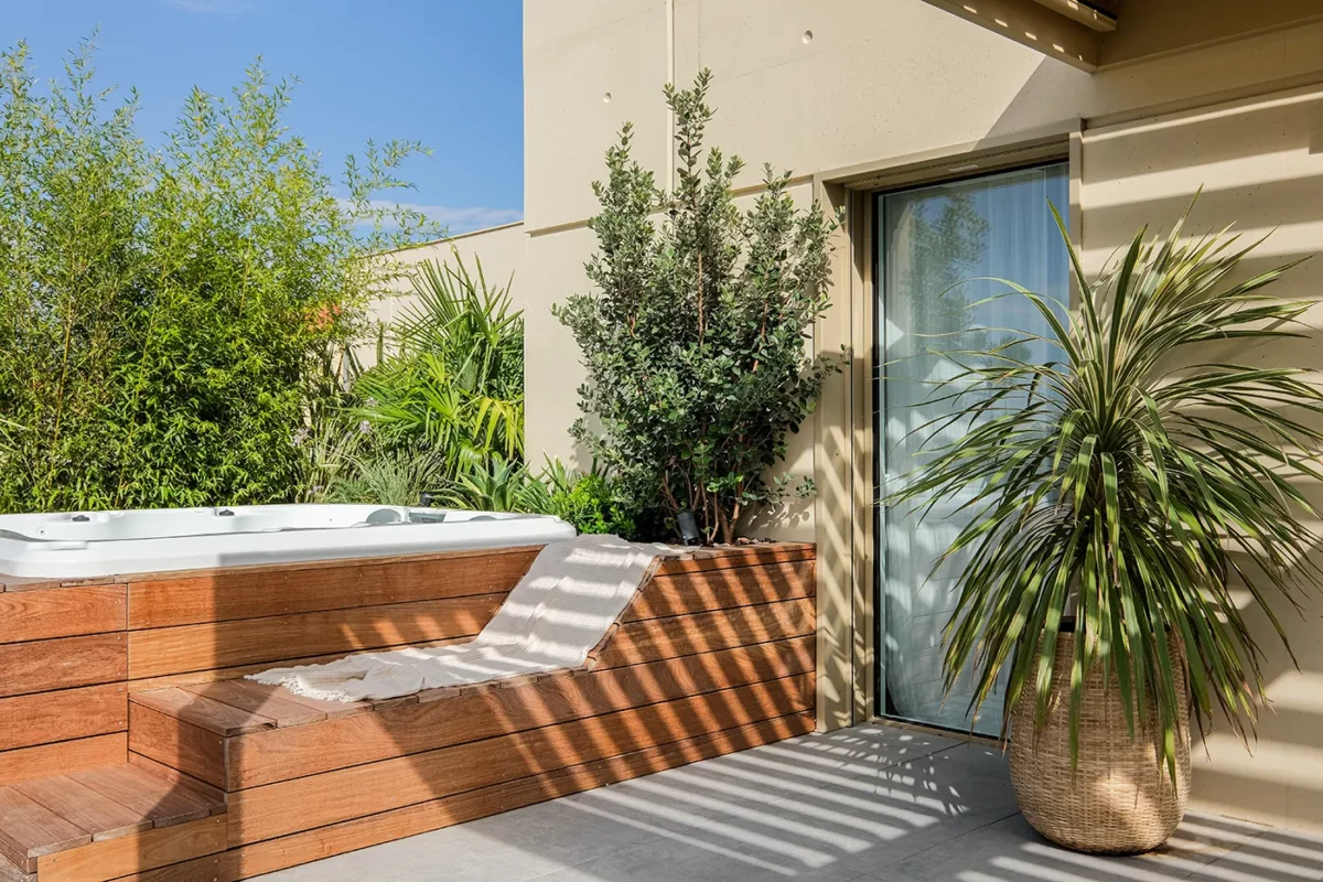 - Un jacuzzi en bois naturel, alliant élégance et bien-être.