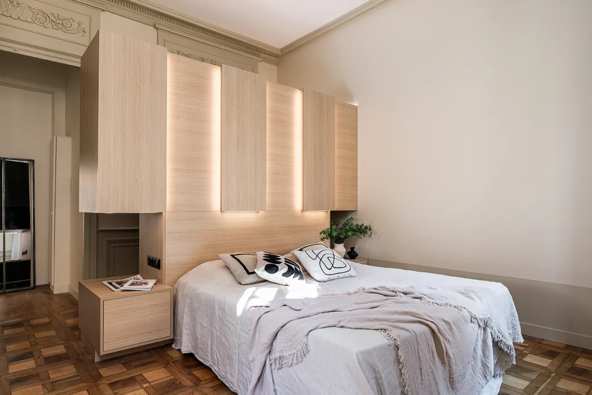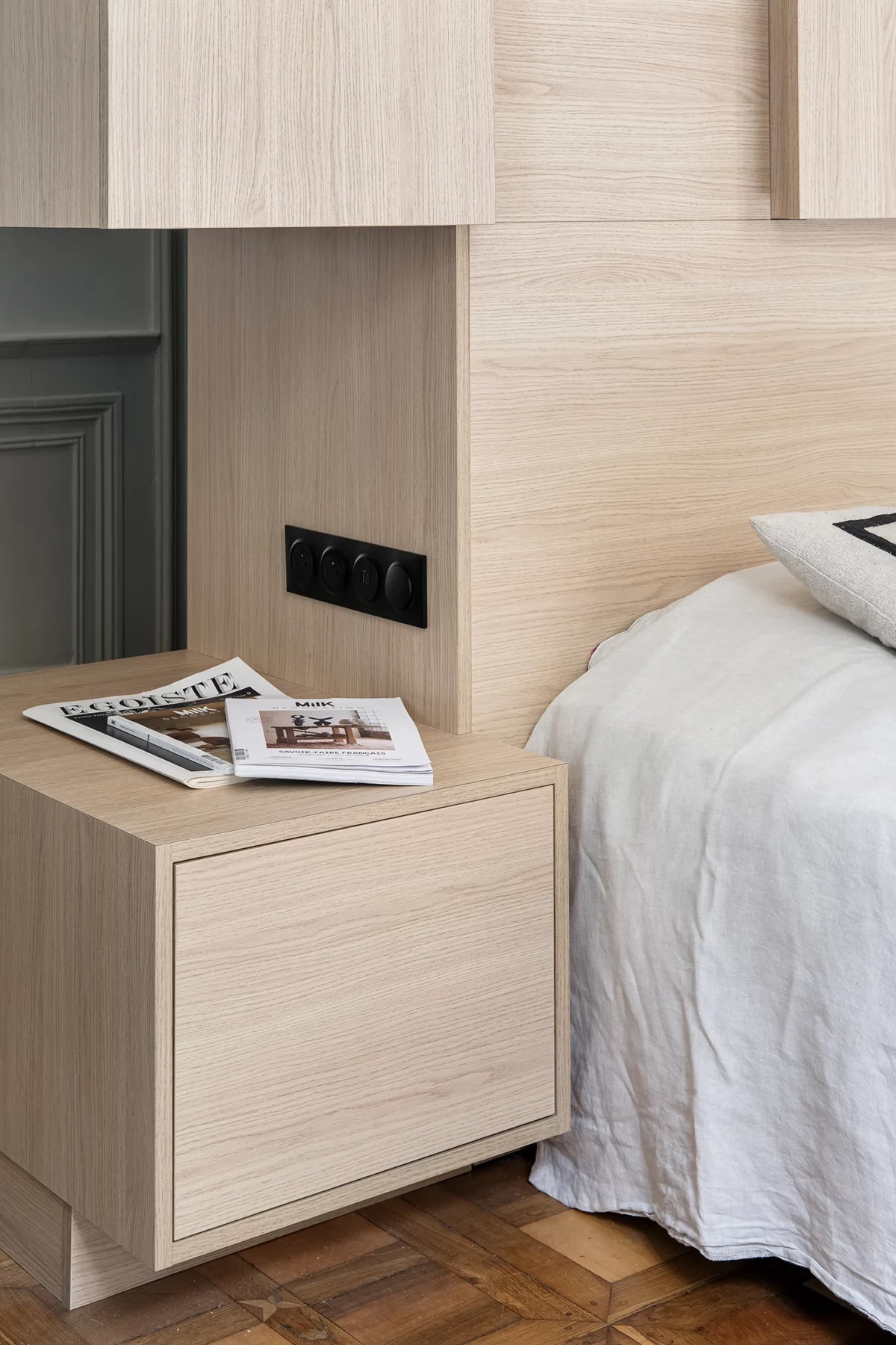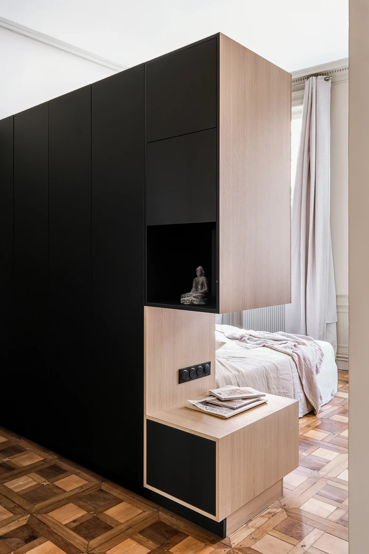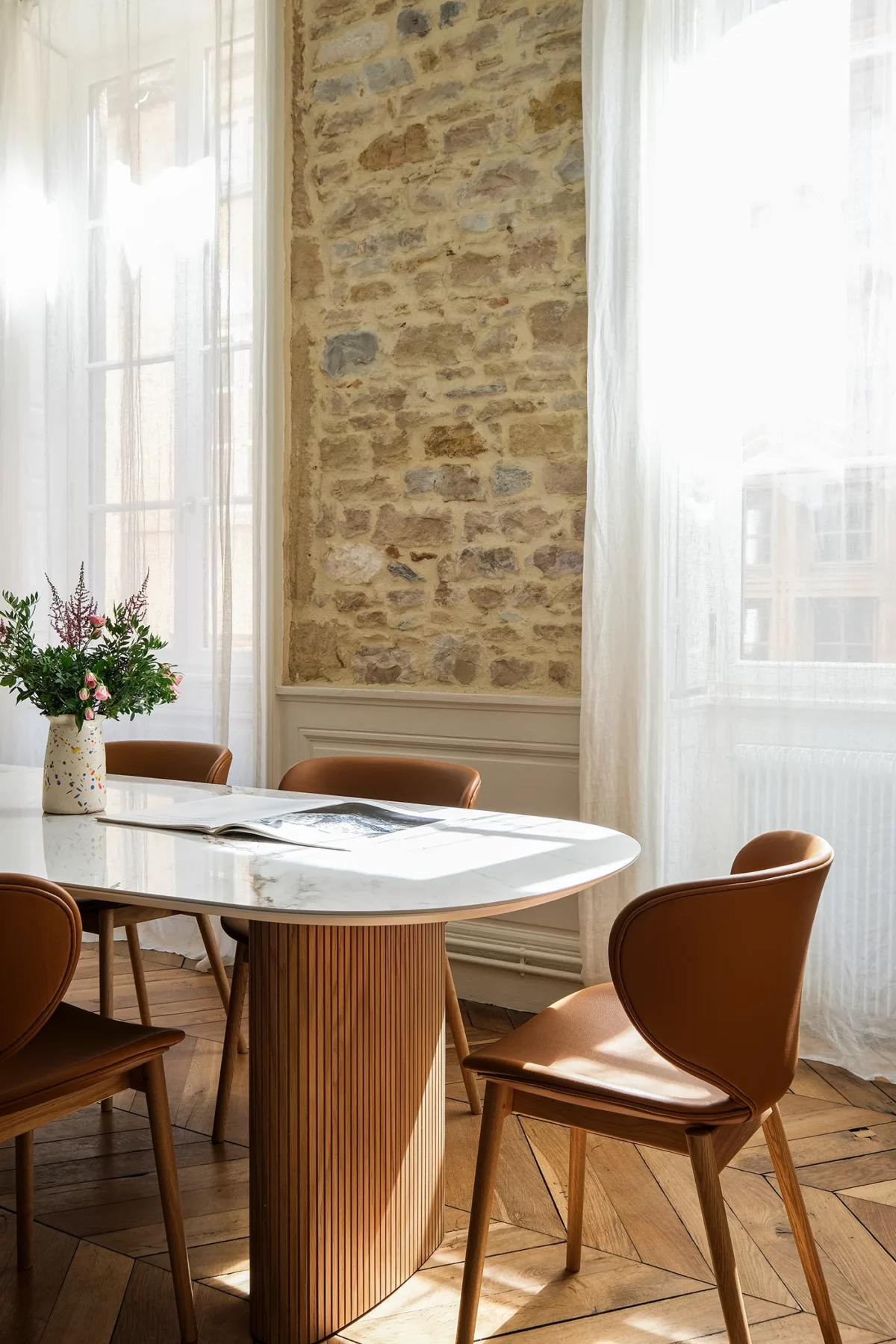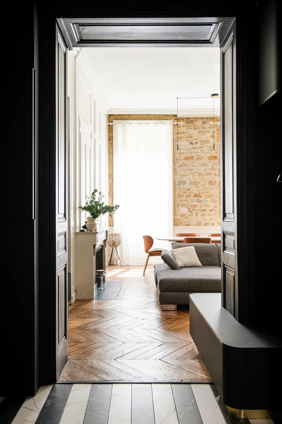 • Dialogue des époques : des boiseries historiques préservées s’intègrent harmonieusement à des aménagements minimalistes et contemporains.
