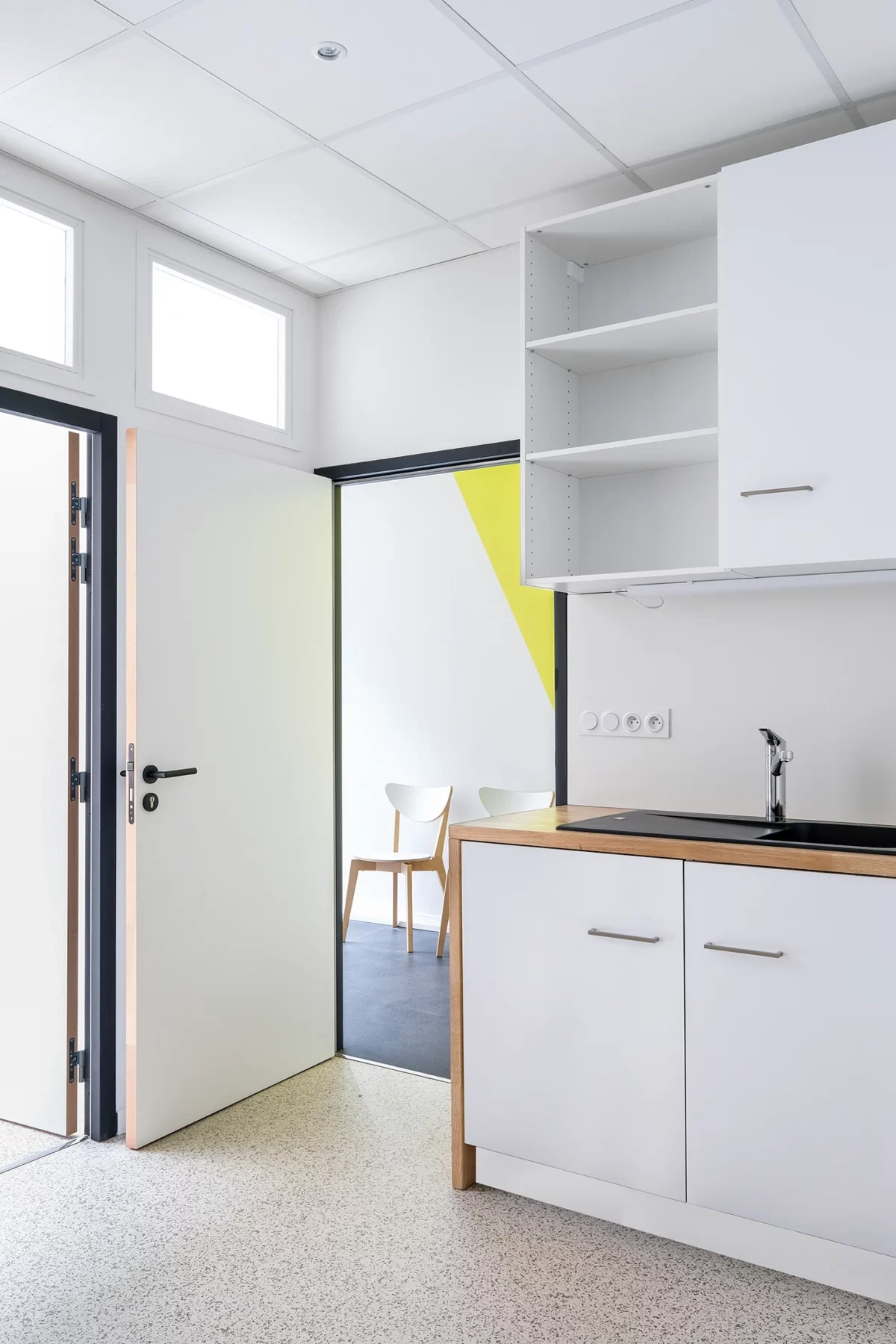 Pour insuffler une identité forte à ce cabinet, nous avons choisi une teinte jaune lumineuse. Cet élément graphique, appliqué en aplat mural et prolongé sur la porte, guide subtilement les patients et crée un jeu de perspectives unique. Ce choix apporte à l’espace une atmosphère dynamique tout en renforçant son caractère moderne.